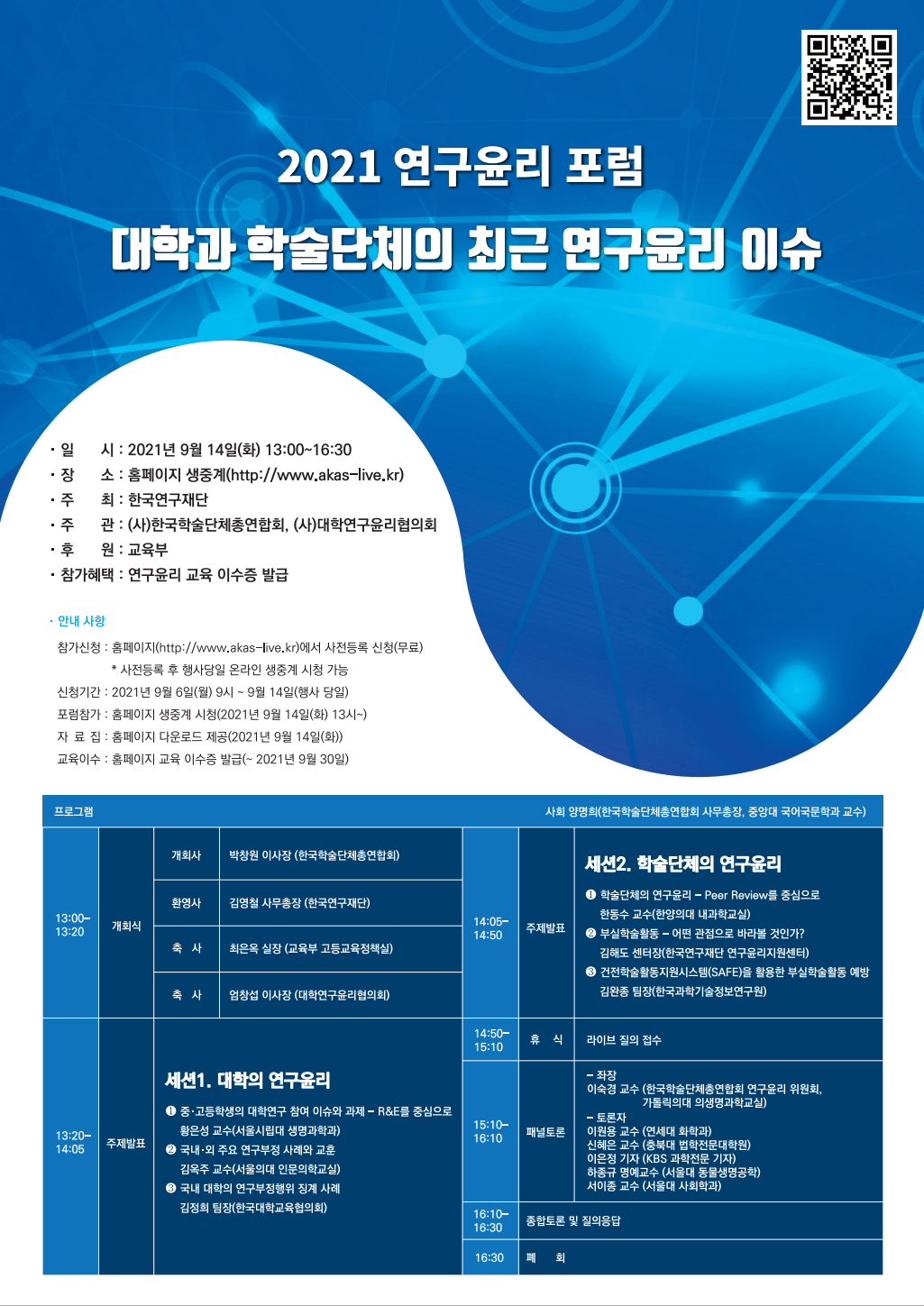 한국학술단체총연합회는 교육부와 한국연구재단의 지원을 받아 「 대학과 학술단체의 최근 연구윤리 이슈 」 라는 대주제로 2021년 국내 연구윤리 포럼을 개최합니다. 세션1에서는 중고등학생의 대학연구 참여 이슈와 과제, 국내외 주요 연구 부정 사례와 교훈, 국내 대학의 연구부정행위 징계사례를 알아보고 세션2에서는 학술단체의 연구윤리, 부실학술활동, 건전학술활동지원시스템을 활용한 부실학술활동 예방에 대해 다룰 예정이오니 많은 참석 바랍니다. 감사합니다.