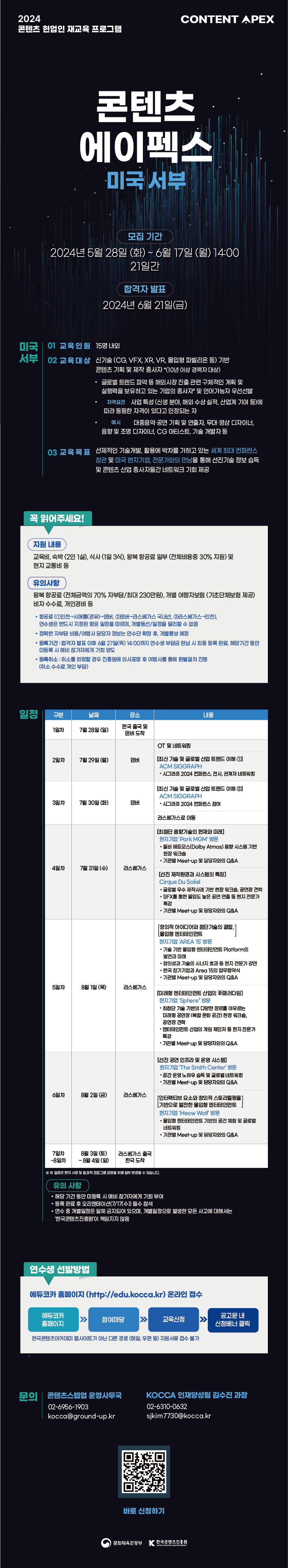[한국콘텐츠진흥원] 2024 현업인 재교육 [콘텐츠 에이펙스(해외교육)- 미국 서부] 연수생을 모집