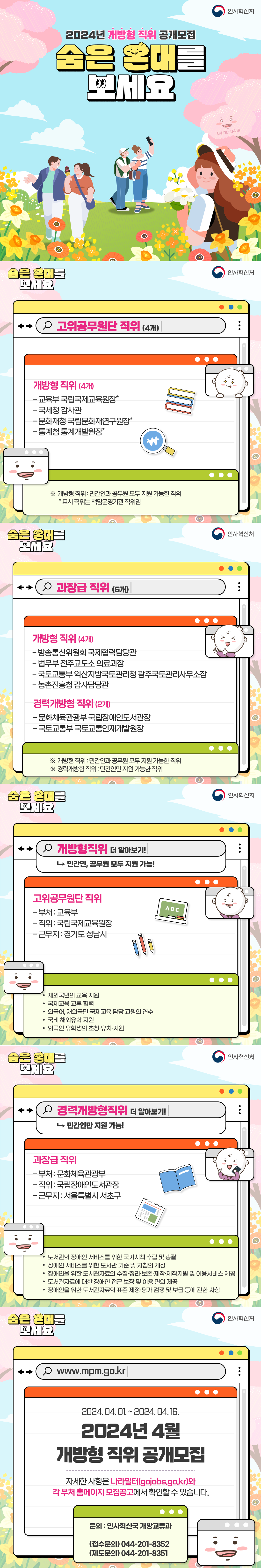 인사혁신처에서는 2024년 4월 고공단 및 과장급 개방형 10개 직위를 붙임과 같이 선발하고 있습니다.
