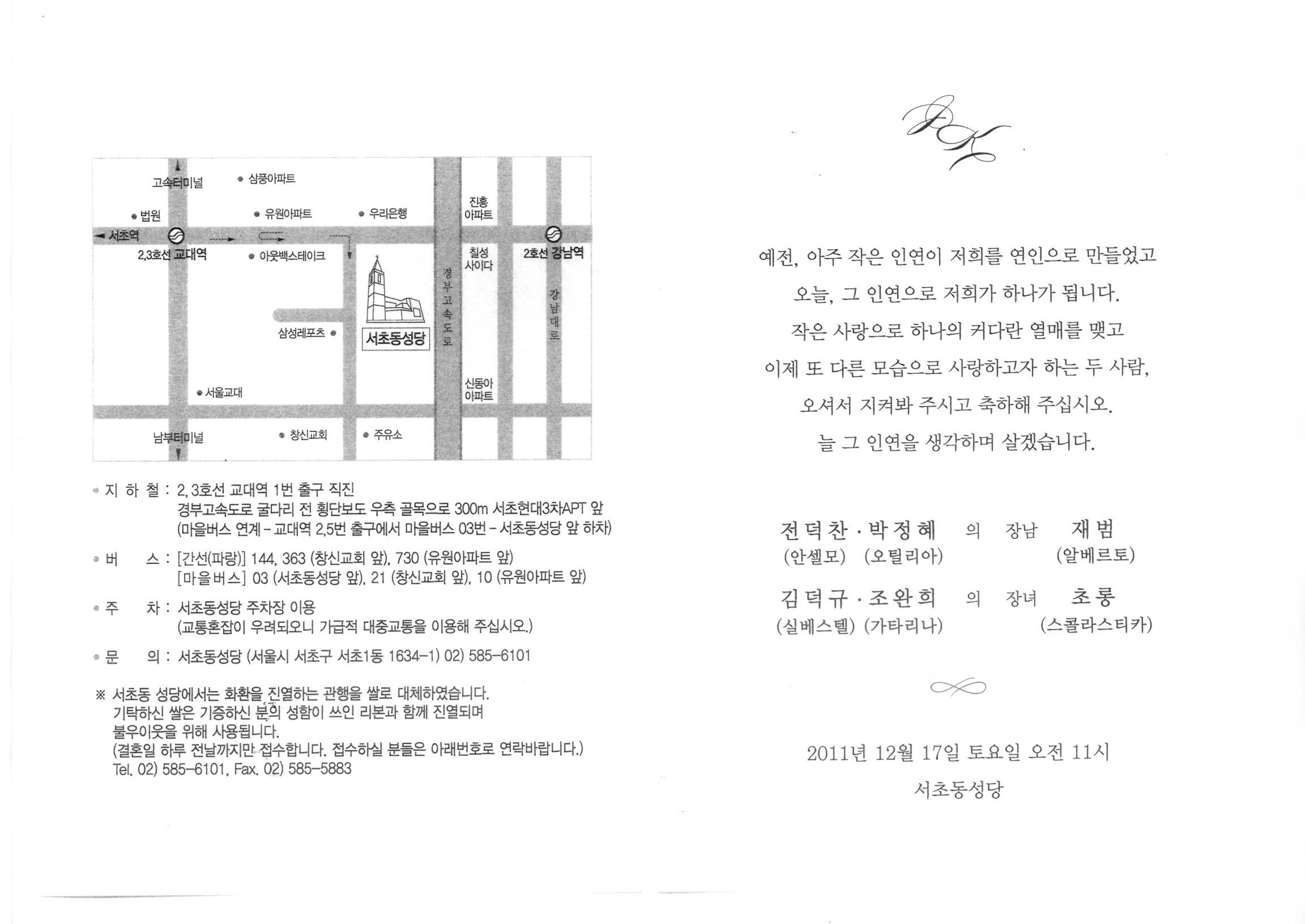 우리학회 회원이신 (주)유신 전덕찬 부사장의 자녀 결혼식이 아래와 같이 있어 안내해 드립니다.축하합니다^ㅡ^◎ 일 시 : 2011년 12월 17일 (토) 오전11시◎ 장 소 : 서초동성당