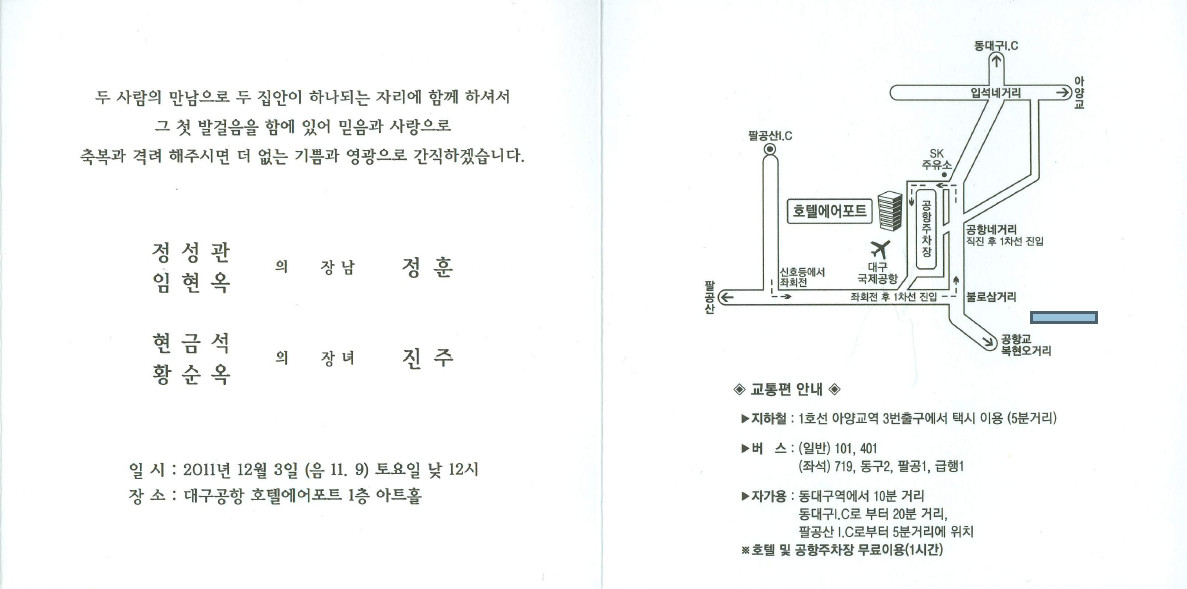 다름이 아니라 이번에 저의 큰아들이 결혼을 하게되었습니다. 차린 것은 별로 없으나 부디 오셔서 새출발을 하려는 아이들에게 축복을 해주시면 감사하겠습니다.
