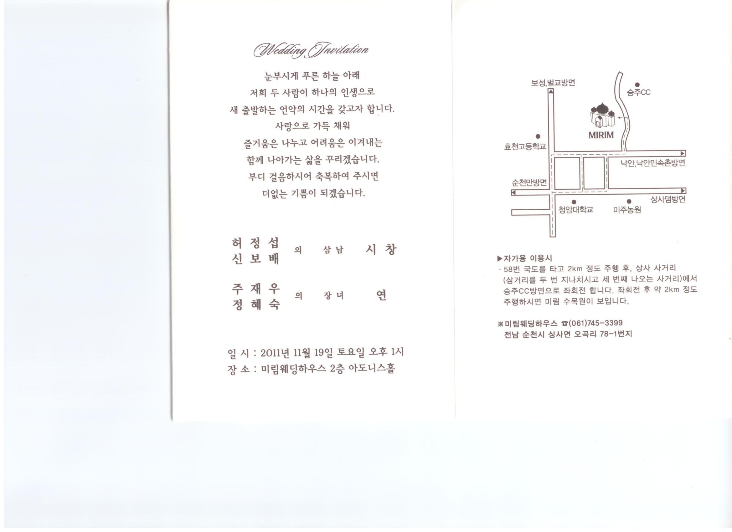 축하합니다 ^ㅡ^우리학회 회원이신 순천대학교 주재우 교수의 자녀 결혼식이 아래와 같이 있어 안내해 드립니다.◆ 일 시 : 2011년 11월 19일 토요일 오후1시◆ 장 소 : 미림웨딩하우스 2층 아도니스홀
