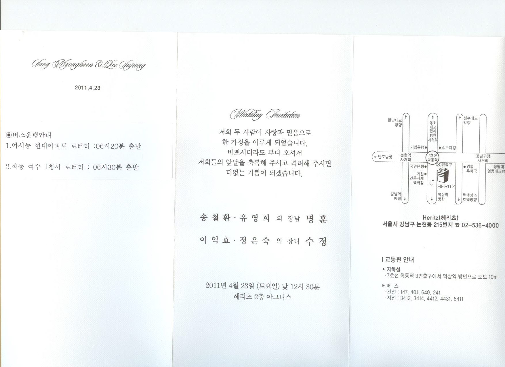 축하합니다 ^ㅡ^ 전남대학교 이익효 교수님의 장녀 결혼식이 다음과 같이 있어 안내해 드립니다. 일 시 : 2011년 4월 23일 (토) 낮12시30분 장 소 : 서울시 강남구 논현동 215번지. 헤리츠 2층 아그니스