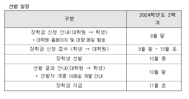 * 2024학년도 2학기에는 단과대학 주관 가계곤란장학금 미선발