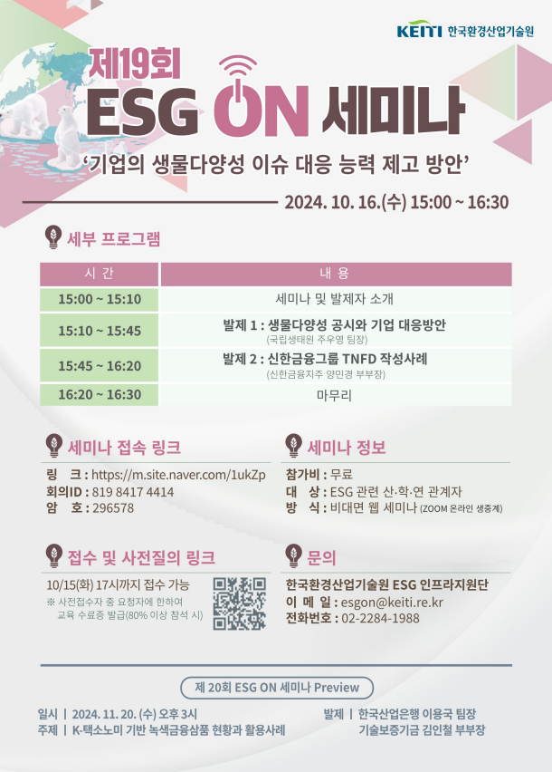 [한국환경산업기술원] 제19회 ESG ON 세미나(10월 16일) 개최 안내