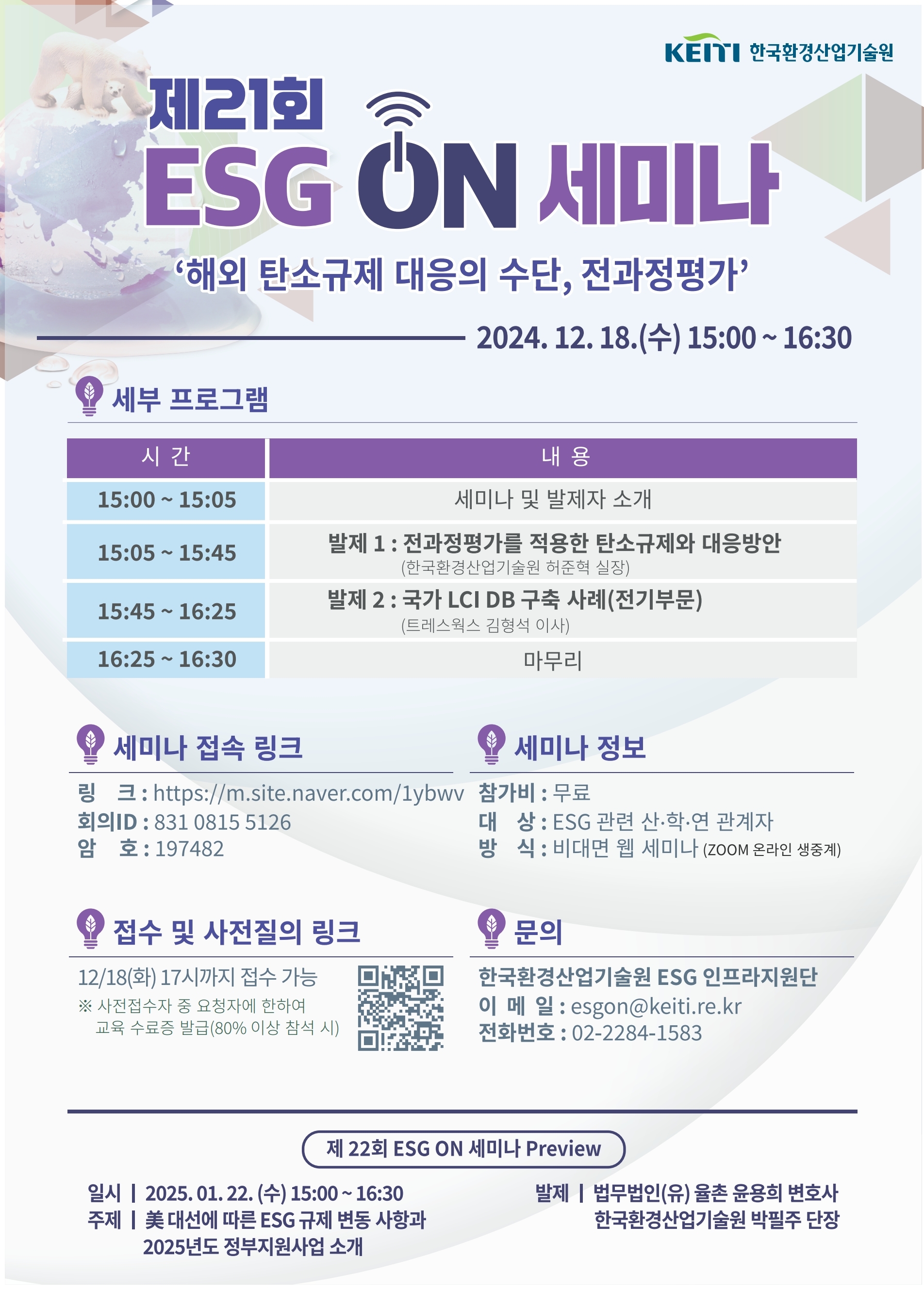 '24.12월은 '해외 탄소규제 대응의 수단, 전과정평가'를 주제로 <제21회 ESG ON 세미나>를 개최합니다.