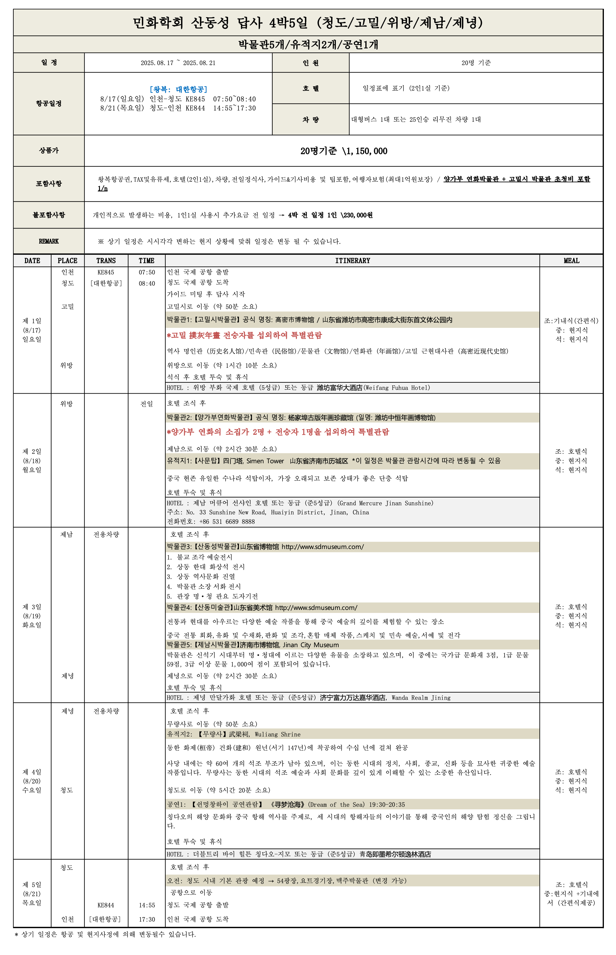 - 2025.8.17.(일) 07:50 인천국제공항 출발 / 08:40 청도국제공항 도착
