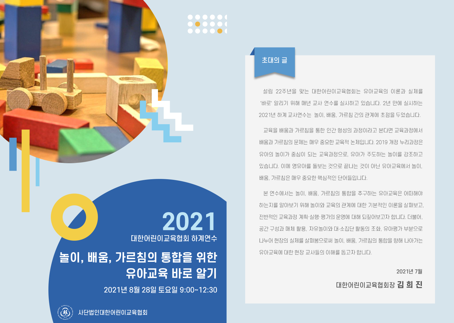 본 협회에서는 2021 하계연수로 '놀이, 배움, 가르침의 통합을 위한 유아교육 바로 알기'와 관련한 내용을 계획하고 있습니다.