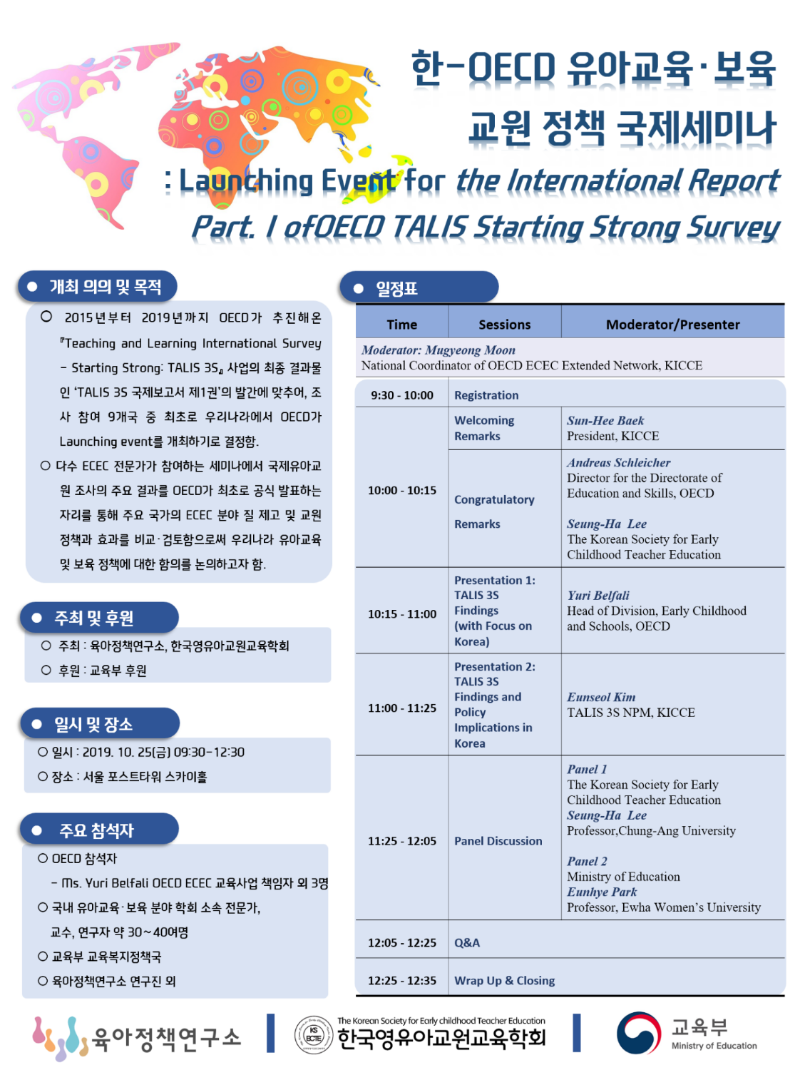 오는 2019년 10월 25일 금요일에 '한-OECD 유아교육·보육 교원정책세미나'가 서울 포스트타워 스카이홀에서 개최됩니다.