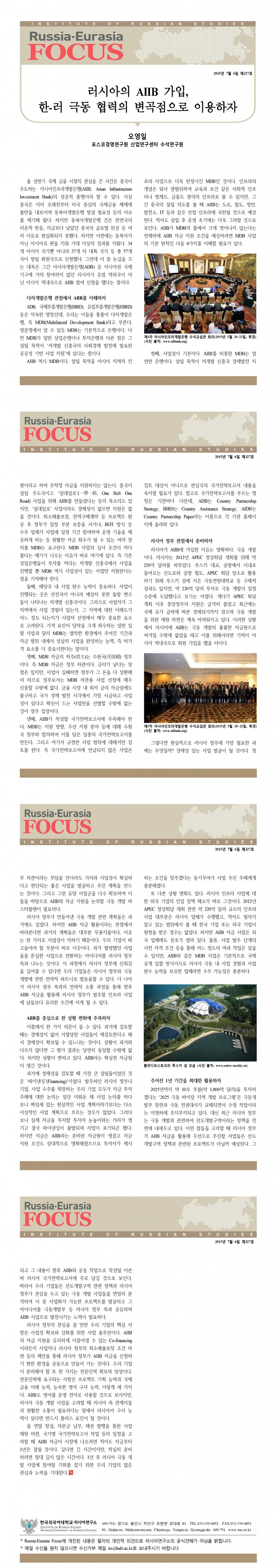 제327호 러시아의 AIIB 가입, 한-러 극동 협력의 변곡점으로 이용하자