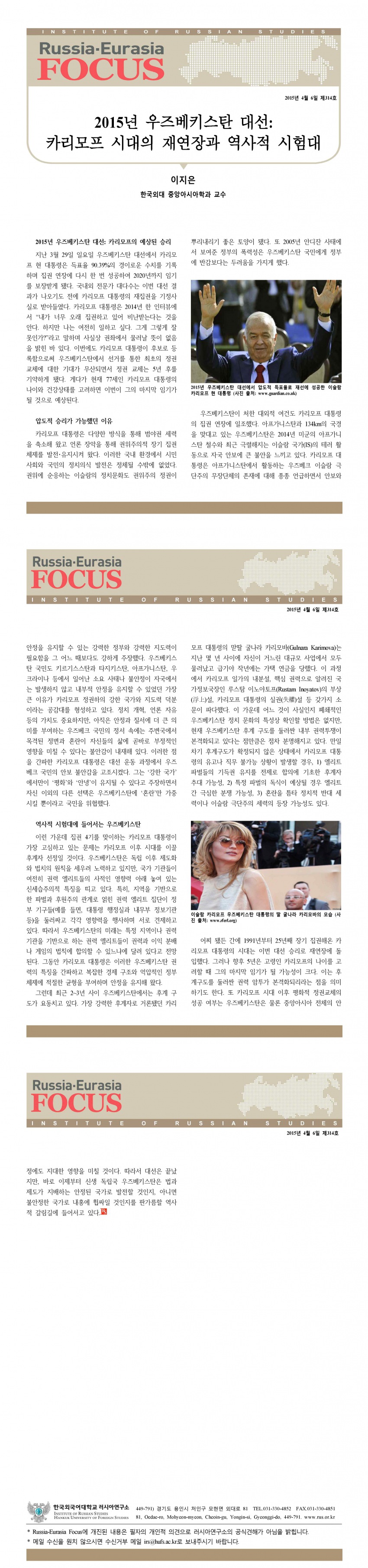 제314호 2015년 우즈베키스탄 대선: 카리모프 시대의 재연장과 역사적 시험대