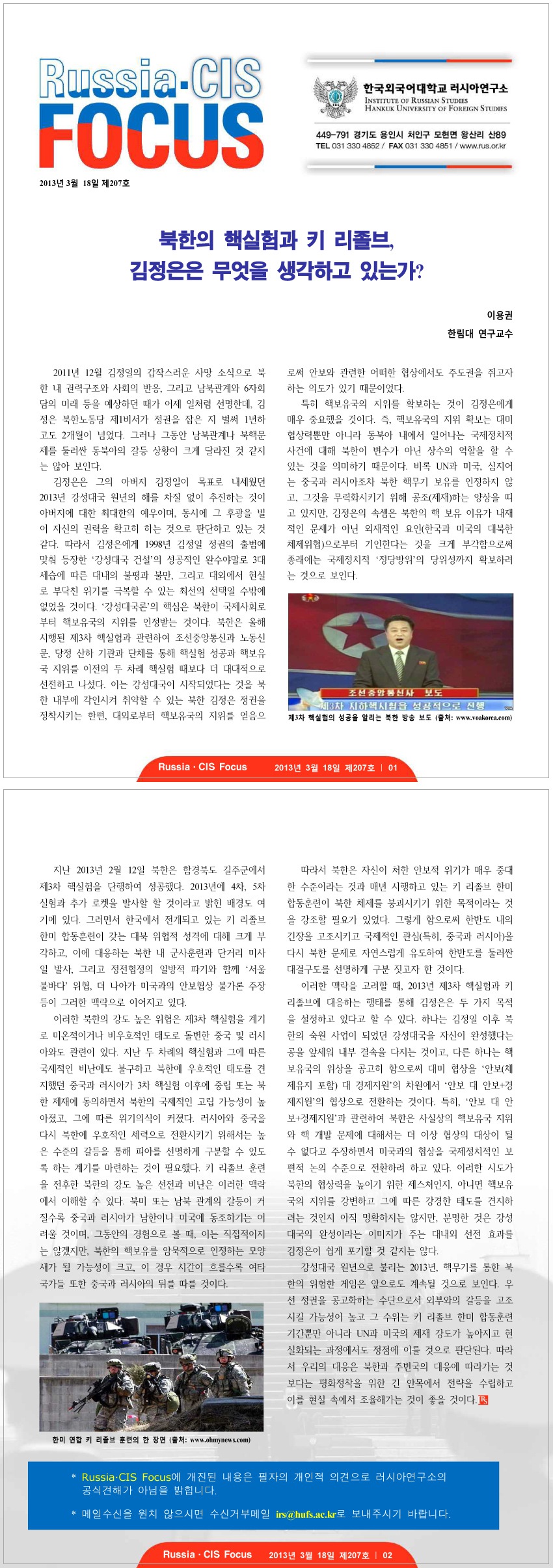 제207호 북한의 핵실험과 키 리졸브, 김정은은 무엇을 생각하고 있는가?