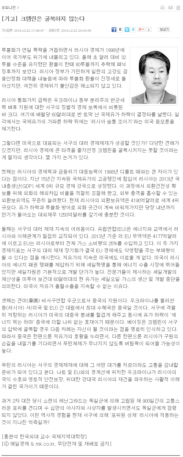 [언론보도][기고/홍완석] 크렘린은 굴복하지 않는다.