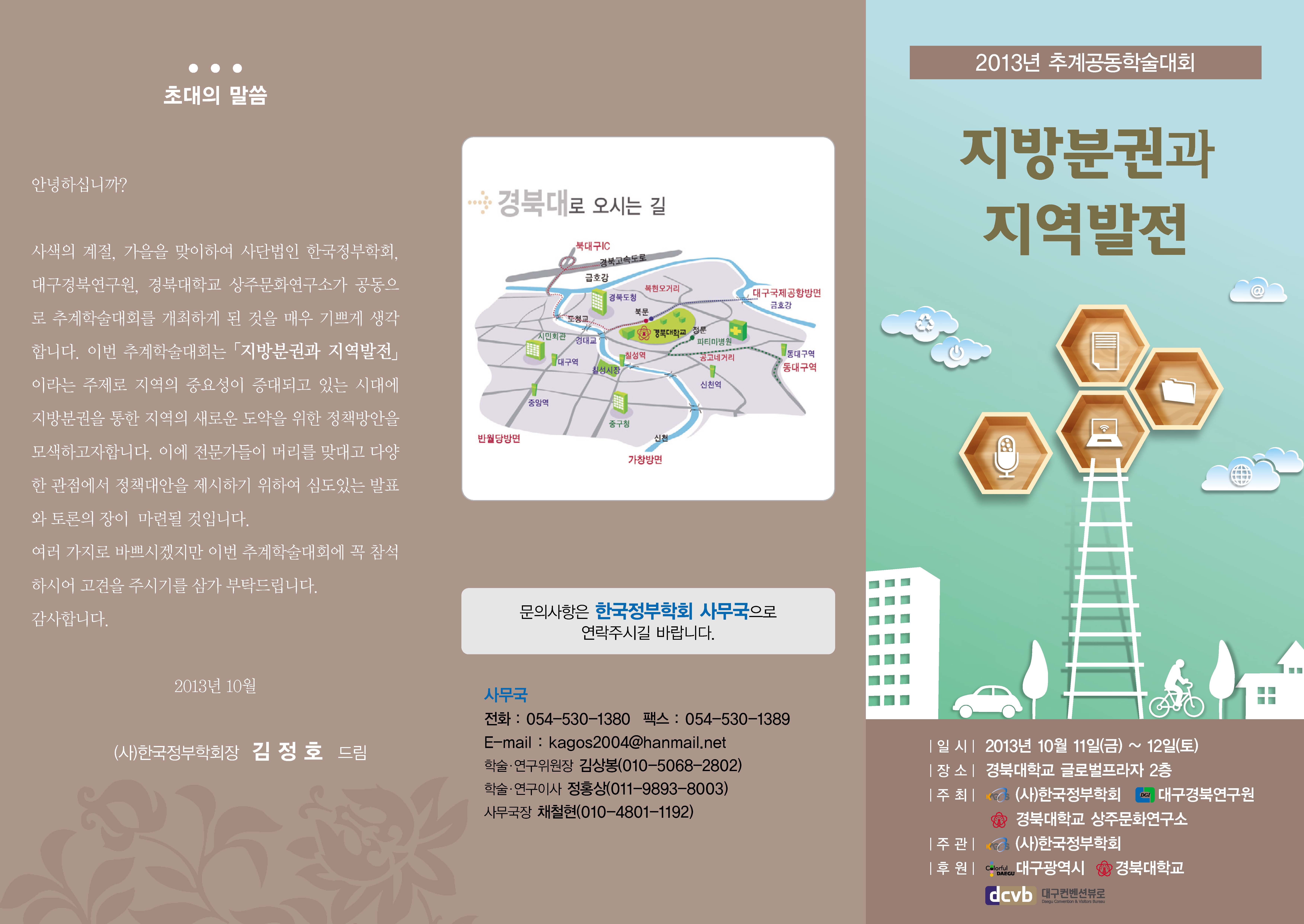 사색의 계절, 가을을 맞이하여 사단법인 한국정부학회, 대구경북연구원, 경북대학교 상주문화연구소가 공동으로 추계학술대회를 개최하게 된 것을 매우 기쁘게 생각합니다. 이번 추계학술대회는 ‘지방분권과 지역발전’이라는 주제로 지역의 중요성이 증대되고 있는 시대에 지방분권을 통한 지역의 새로운 도약을 위한 정책방안을 모색하고자합니다. 이에 전문가들이 머리를 맞대고 다양한 관점에서 정책대안을 제시하기 위하여 심도있는 발표와 토론의 장이 마련될 것입니다.