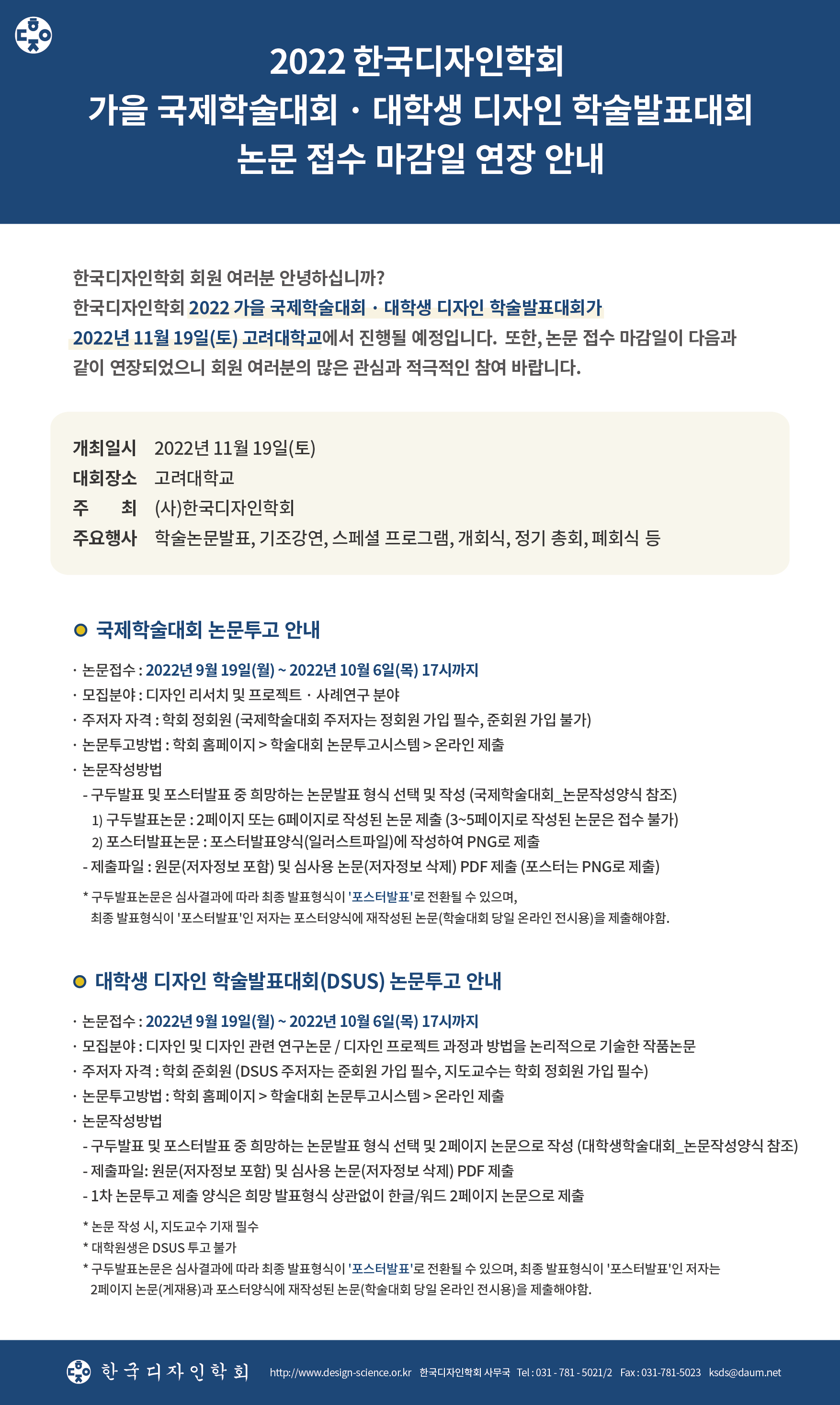 2022 한국디자인학회 가을 국제학술대회 · 대학생 디자인 학술발표대회 논문 접수 마감일 연장 안내(~10/6)