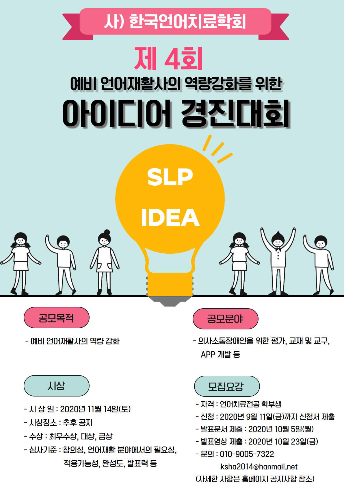 사)한국언어치료학회에서 언어치료전공 재학생들을 대상으로 제 4회 아이디어 경진대회를 개최합니다.