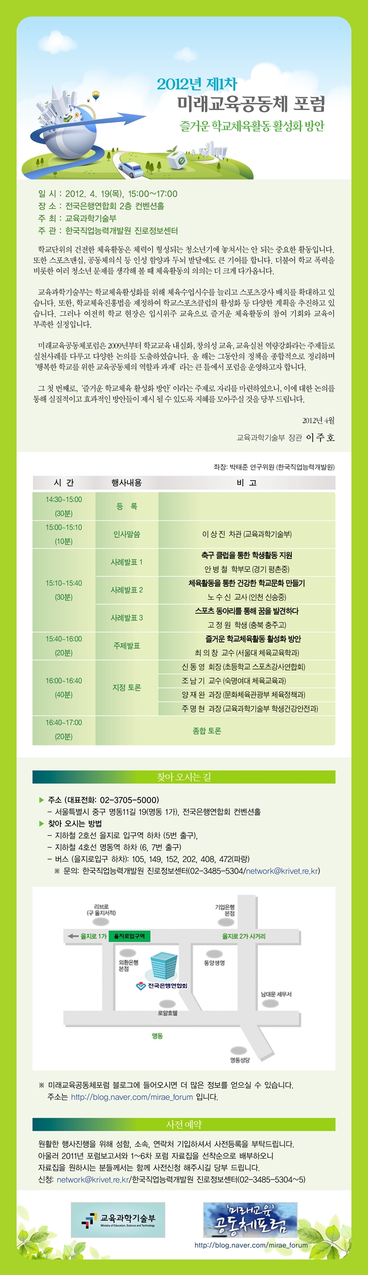 ▣ 프로그램 일정 ○ 주 제 : 즐거운 학교체육활동 활성화 방안 ○ 일 시 : 2012. 4. 19(목), 15:00~17:00 ○ 장 소 : 전국은행연합회 2층 컨벤션홀 ○ 주 최 : 교육과학기술부 ○ 주 관 : 한국직업능력개발원 진로정보센터