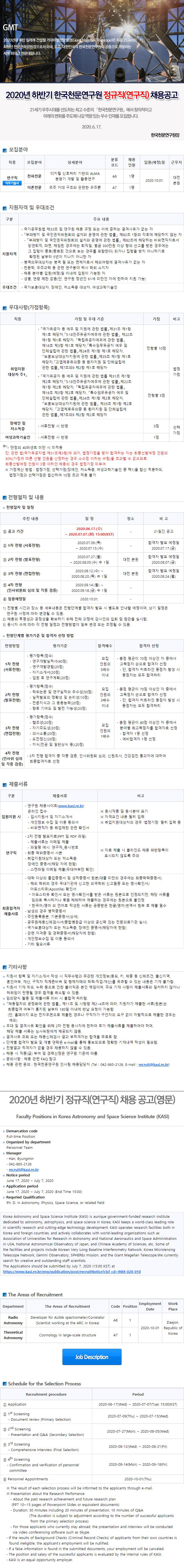 1. 채용내용 : 2020년 하반기 한국천문연구원 정규직(연구직) 채용공고