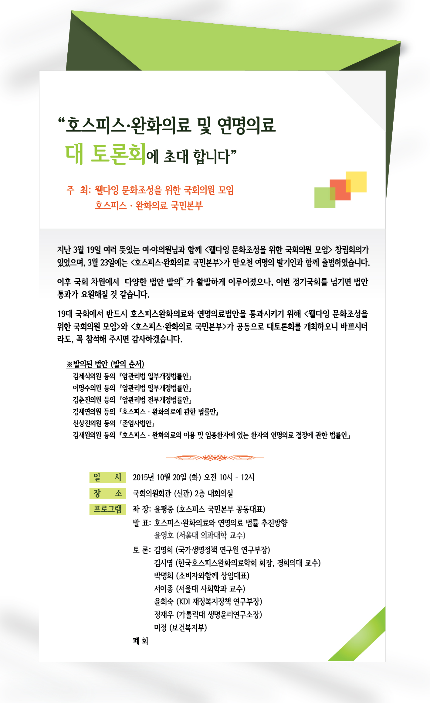 이후 김제식의원 등 『 암관리법 일부개정법률안 』 발의, 이명수의원 등 『암관리법 일부개정법률안』 발의, 김춘진의원 등 『암관리법 전부개정법률안』 발의, 원혜영의원 등 김세연의원 등『호스피스 · 완화의료에 관한 법률안』 발의, 신상진의원 등 『존엄사법안』 발의, 김재원의원 등 『호스피스 · 완화의료의 이용 및 임종환자에 있는 환자의 연명의료 결정에 관한 법률안』발의 등 국회 차원에서의 법안 발의가 활발하게 이루어졌습니다. 이에 호스피스완화의료와 연명의료 제도화에 관한 대토론회를 개최하오니 바쁘시더라도, 꼭 참석해 주시면 감사하겠습니다.