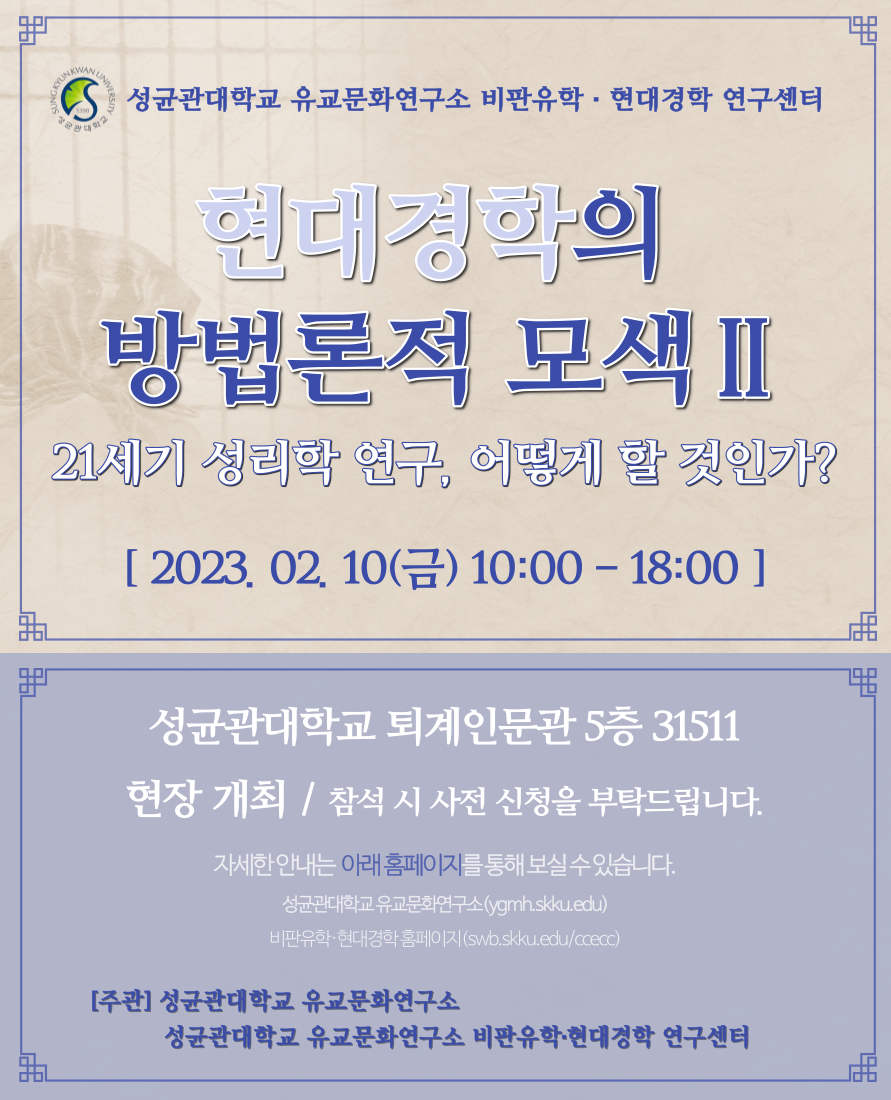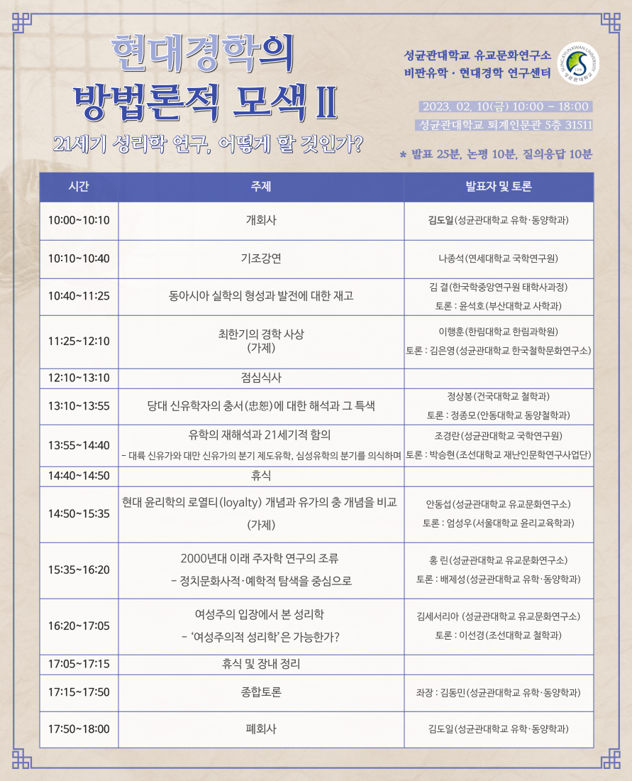 금번 학술대회에서는 지난 학술대회의 성과를 바탕으로 2월 10일(금)에 <현대경학의 방법론적 모색Ⅱ - 21세기 성리학 연구, 어떻게 할 것인가?>를 주제로 고민의 시간을 가져보고자 합니다. 여러 선생님들의 발표를 통해 성리학을 둘러싼 상반된 시선과 다양한 연구방법론의 시도들을 회고하고 앞으로의 현대경학 방법론을 모색하는 의미 있는 장이 될 것으로 기대합니다. 뜻을 함께 하시는 선생님들의 관심 부탁드립니다.