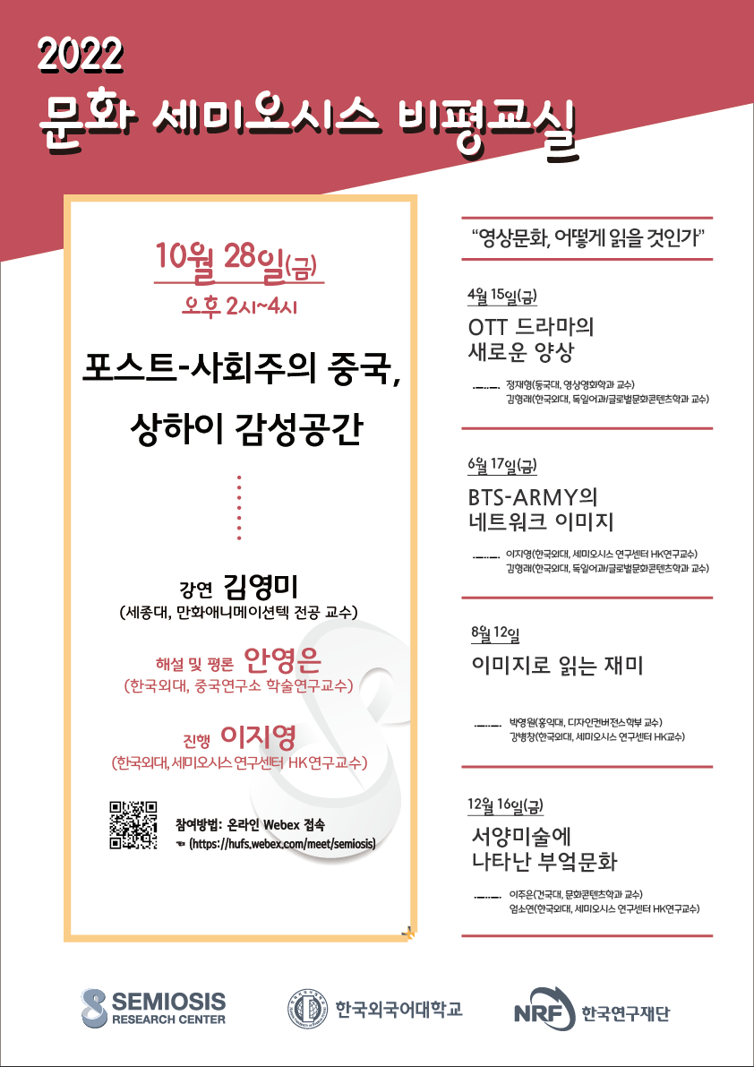 한국외대 세미오시스 연구센터(센터장 서종석)는 10월 28일(금)에 제4회 <문화 세미오시스 비평교실> (온라인)을 개최합니다.