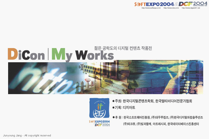 '디콘 my works' 전시회 - '소프트엑스포 & 디지털 컨텐츠 페어 2004' 빠르게 변화하는 국제사회에 깊이 파고드는 디지털 문화는 예술의 영역을 확장시켰고 예술적 감성을 표현 할 수 있는 기회와 여건을 세대와 연령에 관계 없이 넓게 확장시키고 있다. 또한 확장된 예술의 영역은 이제 컴퓨터의 발전으로 표현수단의 무한한 가능성을 제시하고있어 도래하는 유비쿼터스 시대에는 문화 예술의 정보를 언제 어디서나 얻을수 있으며 특정한 장소에 얽매이지 않고 예술적 체험도 할 수 있을 것 이다. 과거 아날로그 시대의 공학도들은 기술연구와 개발에만 치중하였지만 디지털 시대에 이들은 이제 방대해지고 넓은 공학적인 지식의 탐구와 더불어 보다 감성적인 결과물의 표현방법을 연구함으로써 디지털화 된 사회와 문화속에 노출된 인구의 감성적인 수요에 기여하는 노력이 필요하다. 올해 '소프트엑스포 & 디지털 컨텐츠 페어 2004' 를 위한 이벤트로 사단법인 한국디지털컨텐츠학회의 주최로 마련된 '디콘 my works' 전시회 는 디지털 감성세대에 접어든 젊은 공학도들의 디지털 영상, 3D애니메이션, 웹아트, 모바일 컨텐츠, 인터넷 게임, 가상현실, 디지털 뮤직, 등 감성적이고 창의력이 풍부히 반영된 컴퓨터 공학과의 학생작품들을 중심으로 오늘 12월 2일에서 5일까지 삼성코엑스 태평양홀에서 개최된다. 한국디지털컨텐츠학회는 디지털 감성시대에 관심을 가진 많은 분들의 참여와 교류를 통하여 디지털 문화의 영역안에서 다양한 분야의 접목으로 창출되는 새로운 패러다임을 창출하기 위해 이와같은 전시회를 준비하였다. 국내외 최초로 소프트엑스포에서 처음으로 소개되는 전자 방명록은 오픈식날 방문하는 관객이 기존의 종이 방명록에 서명하는 방식을 벗어나 전자펜을 사용하여 싸인하면 자동으로 싸인이 차례로 입력되고 출력되며 대형스크린을 통한 디지털 영상 및 3D 애니메이션, 디지털 설치작품 Happy dog , 미래형 모니터 암즈 등이 전시회 시각적 이미지와 흥미를 집중시킨다. (사진: 전자 방명록, Happydog , 모니터암즈, 대형스크린) 뿐만아니라 엑스포기간내에 공동주최측인 한국멀티미디어전문가협회는 '멀티미디어 산업 기술발전과 전망' 이라는 주제로 아셈홀에서 세미나를 개최한다. 멀티미디어 산업, 기술 발전과 전망 * 행사명 : “멀티미디어 기술발전과 전망” Softexpo 2004 세미나 * 일 시 : 2004년 12월 3일 (금) 오전11시 * 장 소 : Coex 3층 아셈홀 * 주 최 : (사) 한국멀티미디어전문가협회,한국멀티미디어협회 * 후 원 : 정보통신부,KIPA * 문 의 : 02-2205-1113 전시회 관련 문의는 아래연락처를 이용하면 된다. 한국디지털컨텐츠학회 : http://www.dcs.or.kr 전시기획 담당자: 장준영 master@dcs.or.kr 한국멀티미디어전문가협회 http://www.multimedia.or.kr 한국소프트웨어진흥원 http://www.softexpo.or.kr 소프트웨어진흥원 박상욱 선임: swpark@software.or.kr