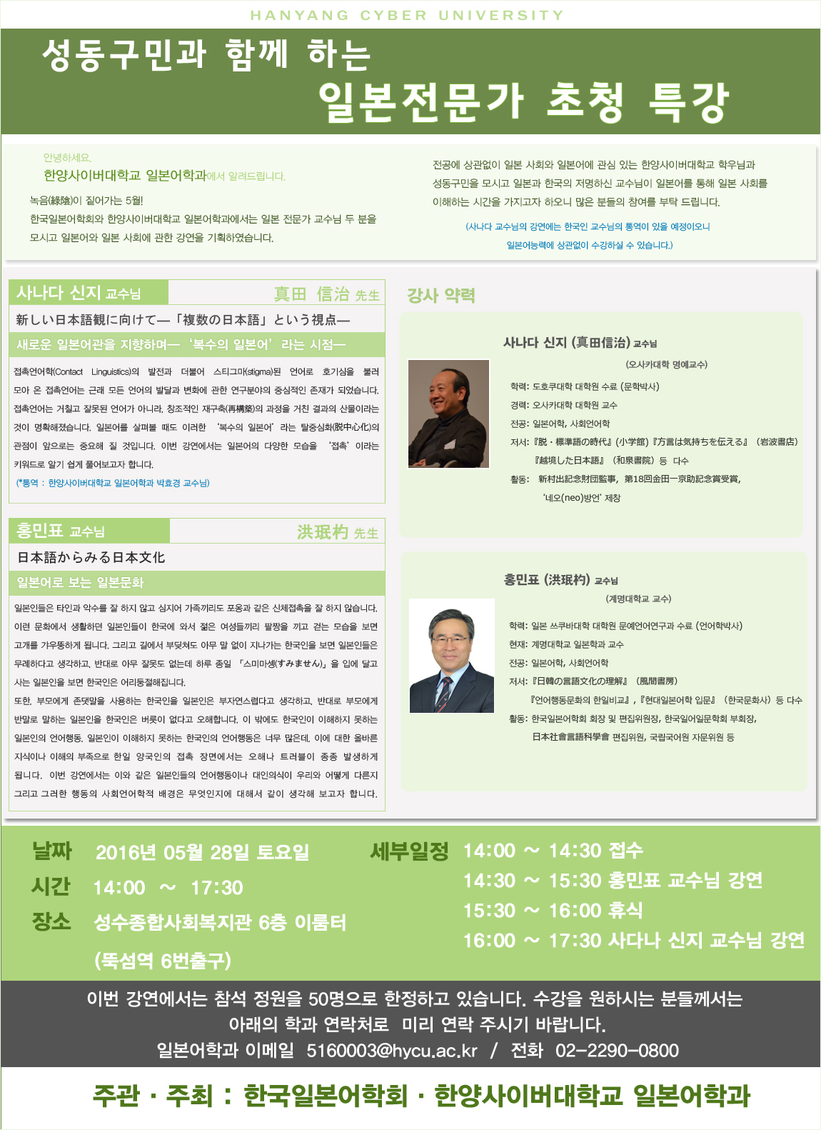 한국일본어학회와 한양사이버대학교 일본어과 공동주최로 「성동구민과 함께하는 일본전문가 초청 특강」을 개최하게 되어 안내드립니다.