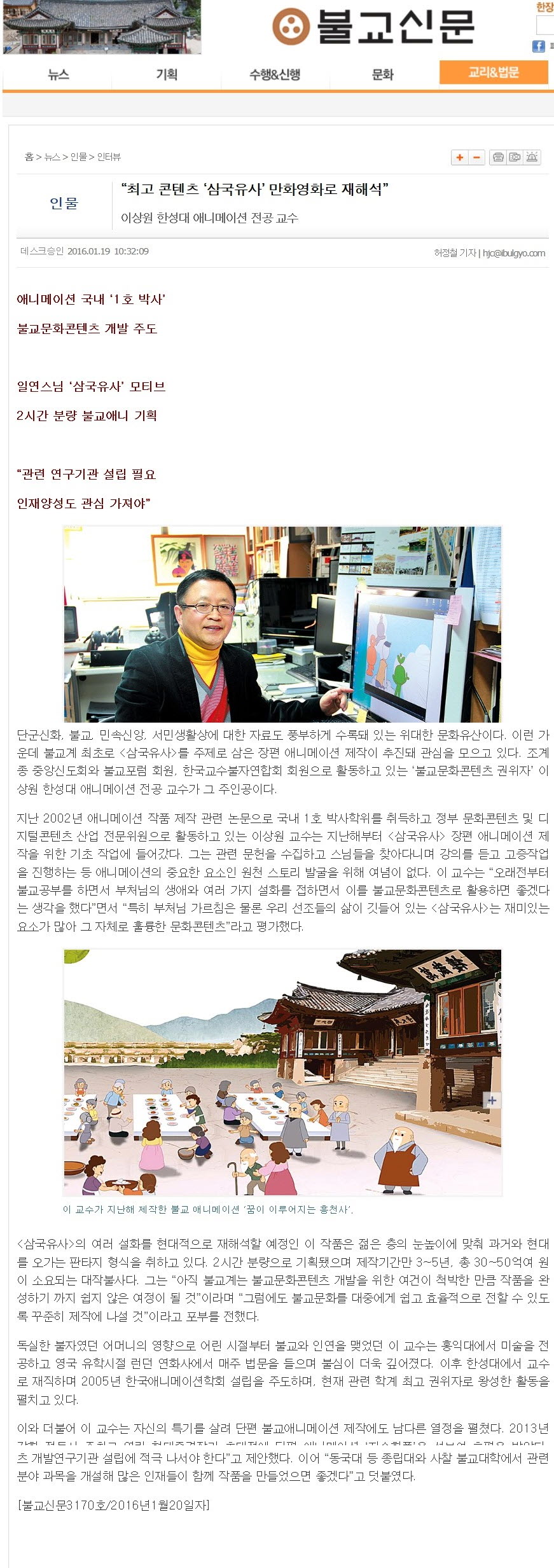 학회 명예회장이신 이상원 한성대 교수님께서 장편 애니메이션 <삼국유사>를 제작한다는 것이 기사화되었습니다.