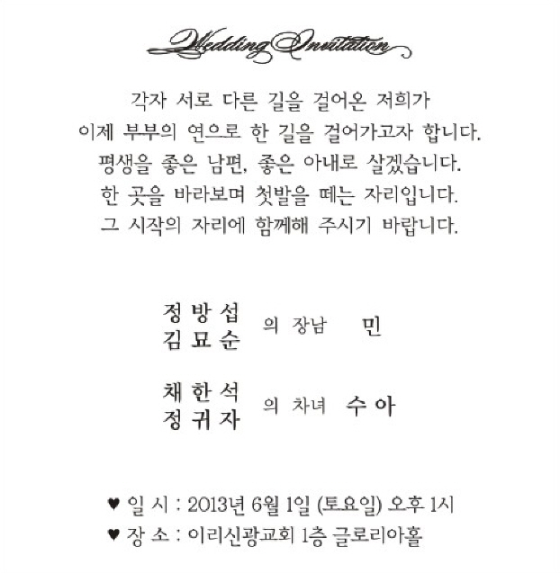 축하합니다 ^_^*우리학회 회원이신 벽산엔지니어링의 정 민 차장의 결혼식이 아래와 같이 있으니, 회원여러분들의 많은 축복 바랍니다.♡ 일 시 : 2013년 6월 1일 토요일 오후 1시♡ 장 소 : 이리신광교회 1층 글로리아홀 (전북 익산시 마동 129-2번지)♡ 연락처 : 010-4733-8497 정 민
