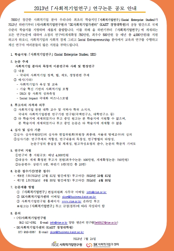 2013년「사회적기업연구」연구논문 공모 안내
