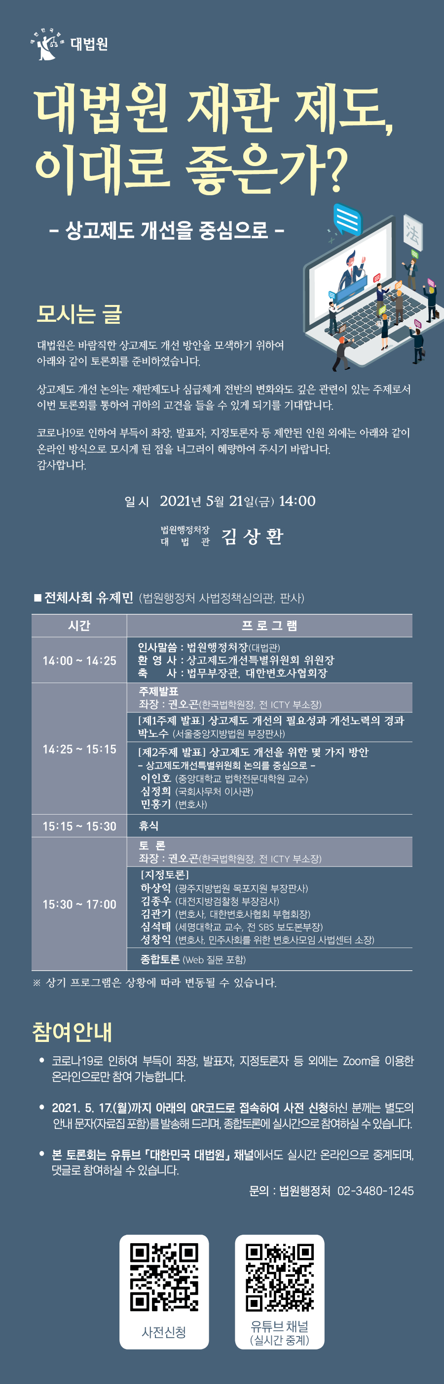 ○ 방식: Zoom 프로그램(토론회 당일에는 유튜브 ‘대한민국 대법원’ 채널을 통하여 실시간 중계도 실시할 예정)을 이용한 온라인 방식(좌장, 발제자, 토론자 등만 현장 참석)