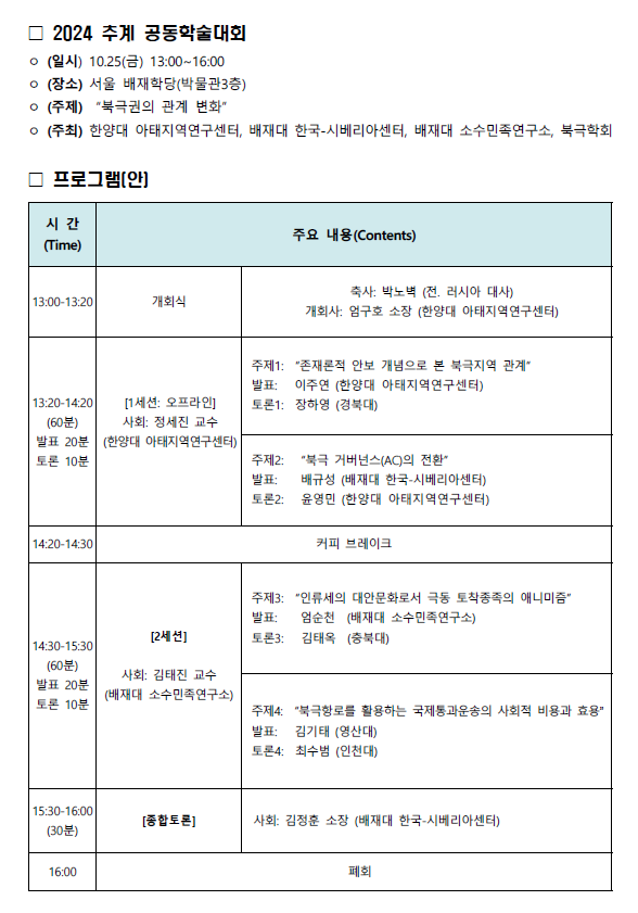 ㅇ 주최: 한양대 아태지역연구센터, 배재대 한국-시베리아센터, 배재대 소수민족연구소, 북극학회