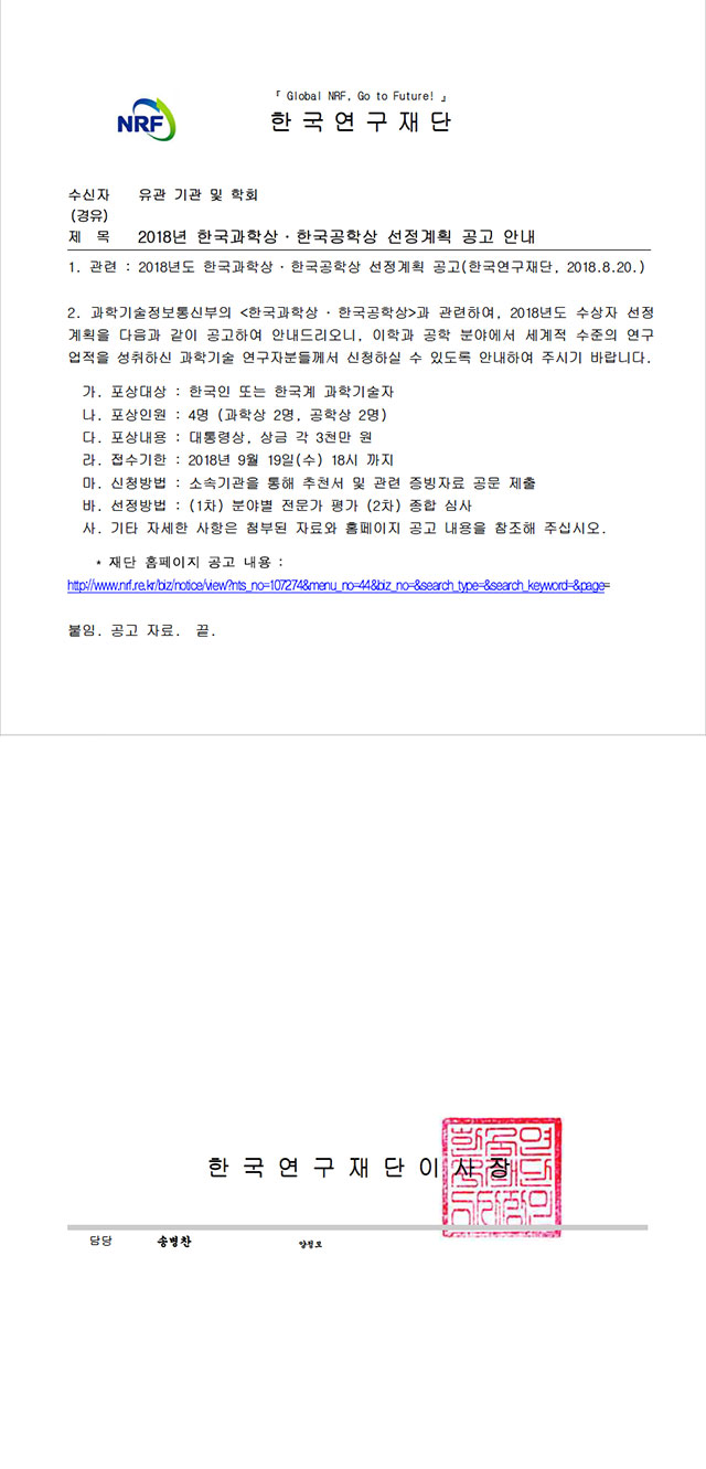 2018년도 한국과학상 및 한국공학상 선정계획 공고 안내