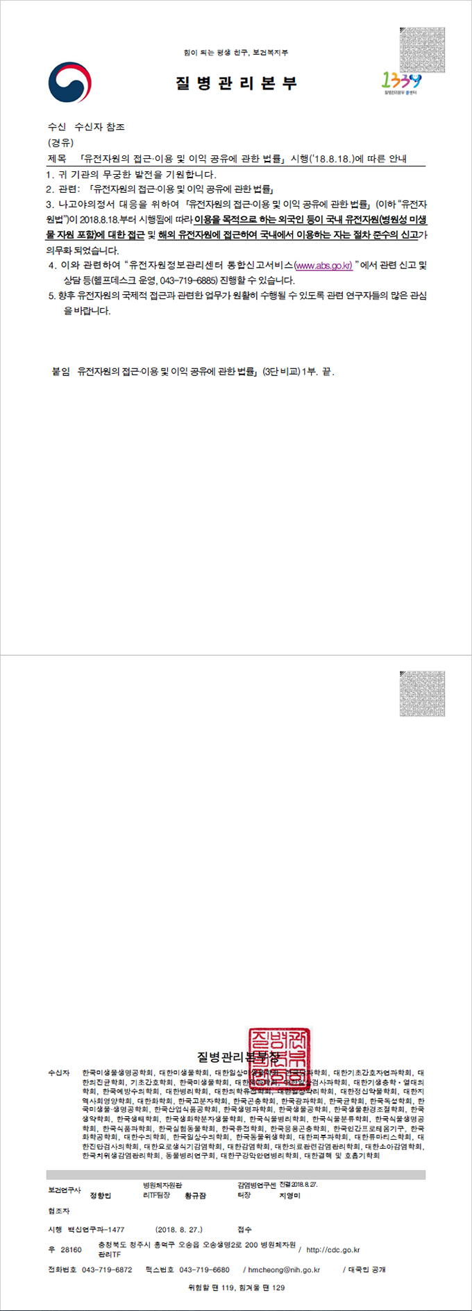 8월 18일 유전자원법 시행에 따른 안내 공문