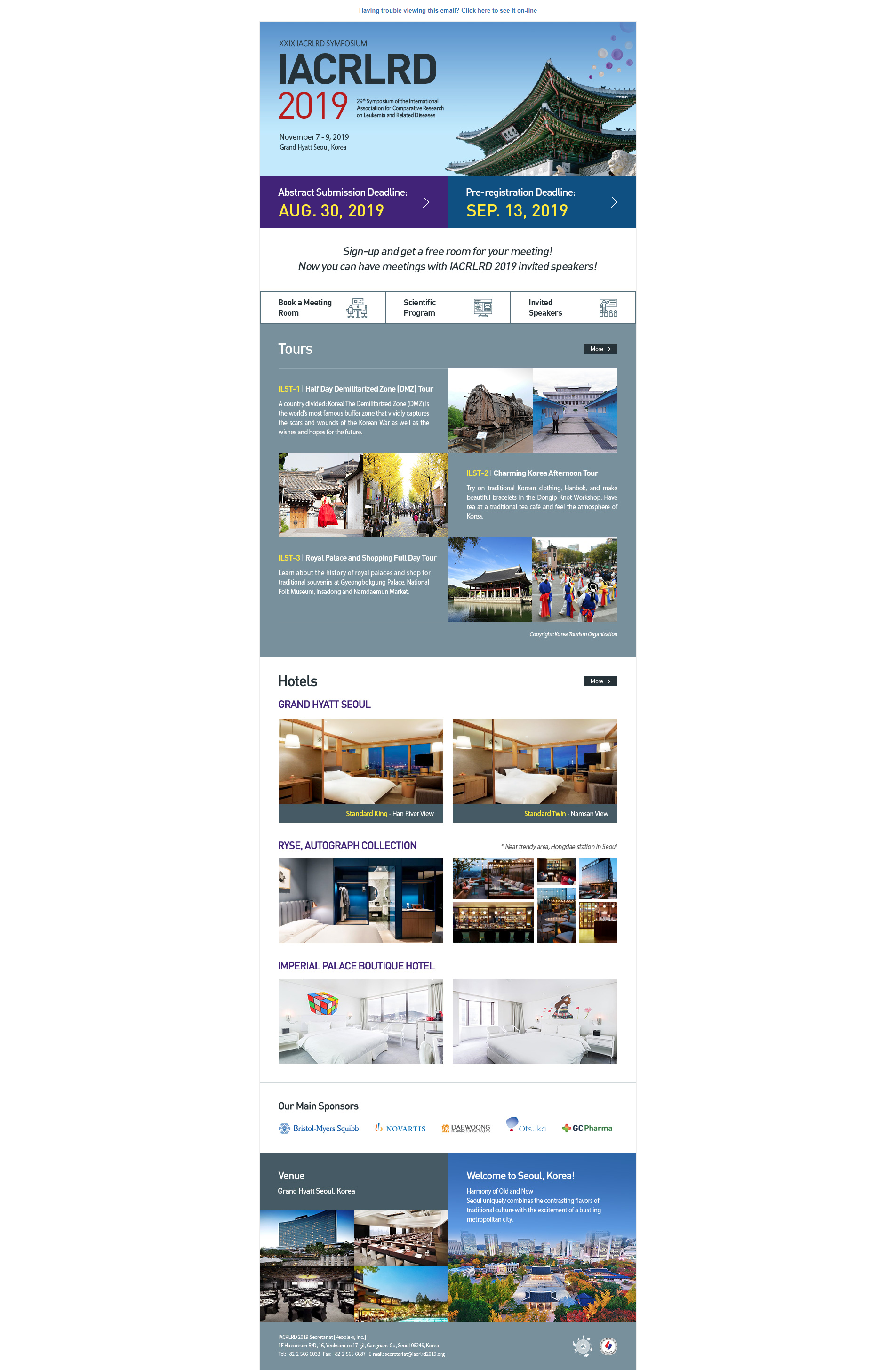 대한혈액학회는 2019년 11월 7일부터 9일까지 그랜드 햐얏트서울 호텔에서 제29회 백혈병연관질환 국제학술대회 (29th Symposium of the International Association for Comparative Research on Leukemia and Related Diseases, IACRLRD 2019)를 개최합니다.