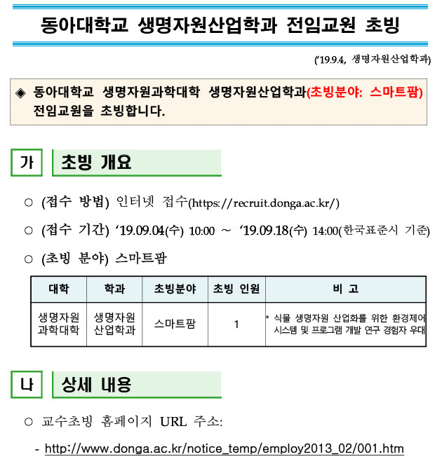 동아대학교 생명자원산업학과 전임교원 초빙