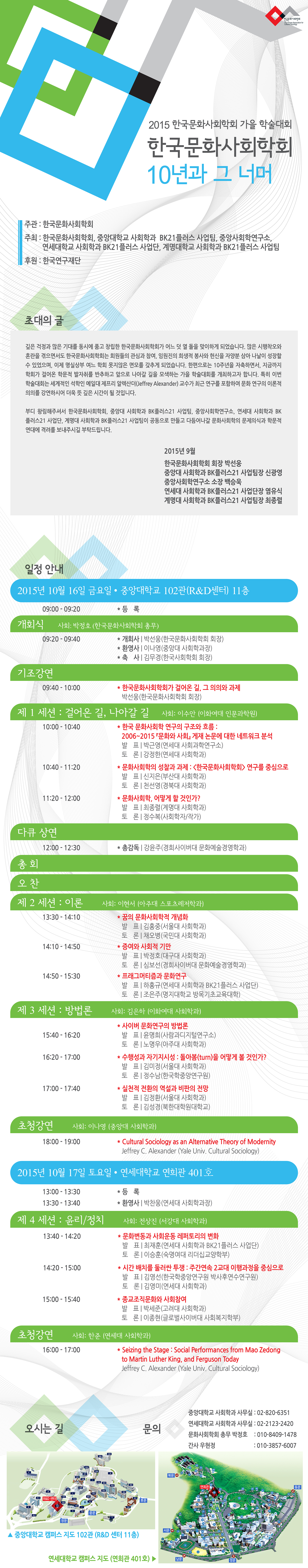 깊은 걱정과 많은 기대를 동시에 품고 창립한 한국문화사회학회가 어느 덧 열 돌을 맞이하게 되었습니다. 많은 시행착오와 혼란을 겪으면서도 한국문화사회학회는 회원들의 관심과 참여, 임원진의 희생적 봉사와 헌신을 자양분 삼아 나날이 성장할 수 있었으며, 이제 명실상부 여느 학회 못지않은 면모를 갖추게 되었습니다. 한편으로는 10주년을 자축하면서, 지금까지 학회가 걸어온 학문적 발자취를 반추하고 앞으로 나아갈 길을 모색하는 가을 학술대회를 개최하고자 합니다. 특히 이번 학술대회는 세계적인 석학인 예일대 제프리 알렉산더(Jeffrey Alexander) 교수가 최근 연구를 포함하여 문화 연구의 이론적 의의를 강연하시어 더욱 뜻 깊은 시간이 될 것입니다부디 왕림해주셔서 한국문화사회학회, 중앙대 사회학과 BK플러스21 사업팀, 중앙사회학연구소, 연세대 사회학과 BK플러스21 사업단, 계명대 사회학과 BK플러스21 사업팀이 공동으로 만들고 다듬어나갈 문화사회학의 문제의식과 학문적 연대에 격려를 보내주시길 부탁드립니다.