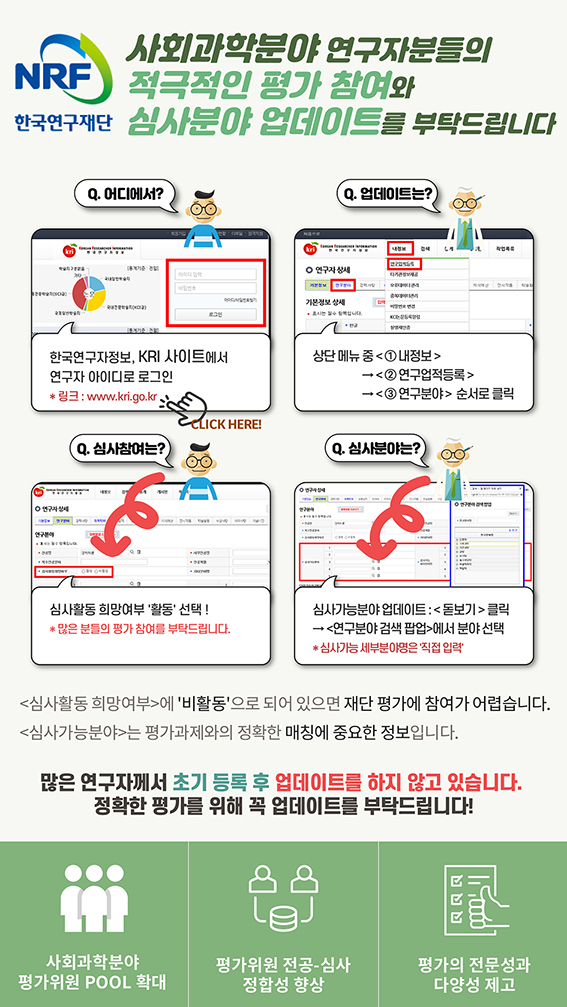 [한국연구재단 사회과학단] 사회과학분야 평가위원 Pool 확대를 위한 KRI 정보 업데이트