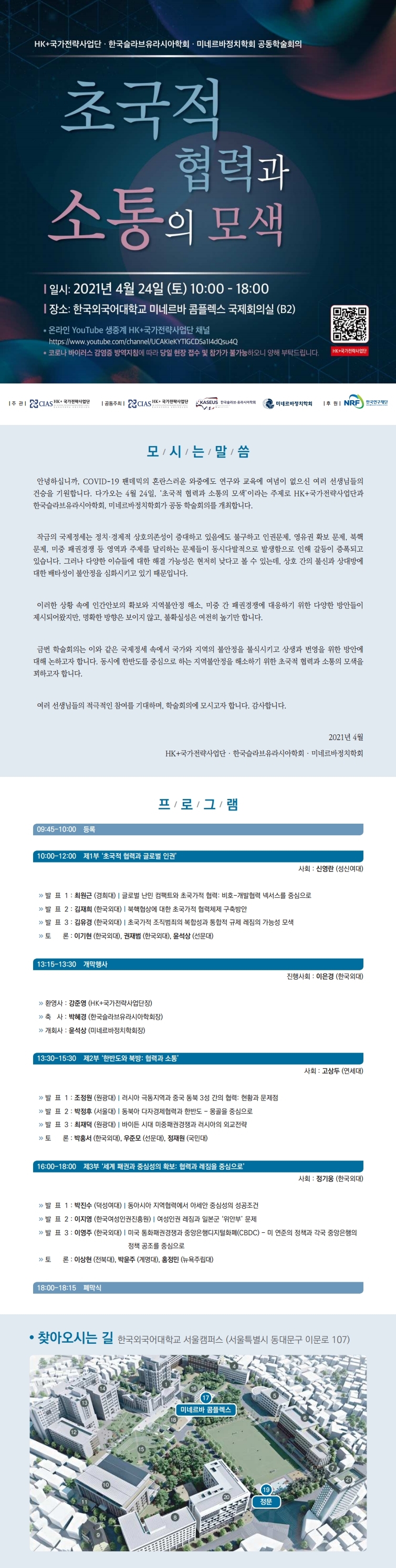 4월 24일 한국외국어대학교 국제지역연구센터 HK+국가전략사업단 · 한국슬라브유라시아학회 · 미네르바정치학회 공동학술회의 안내