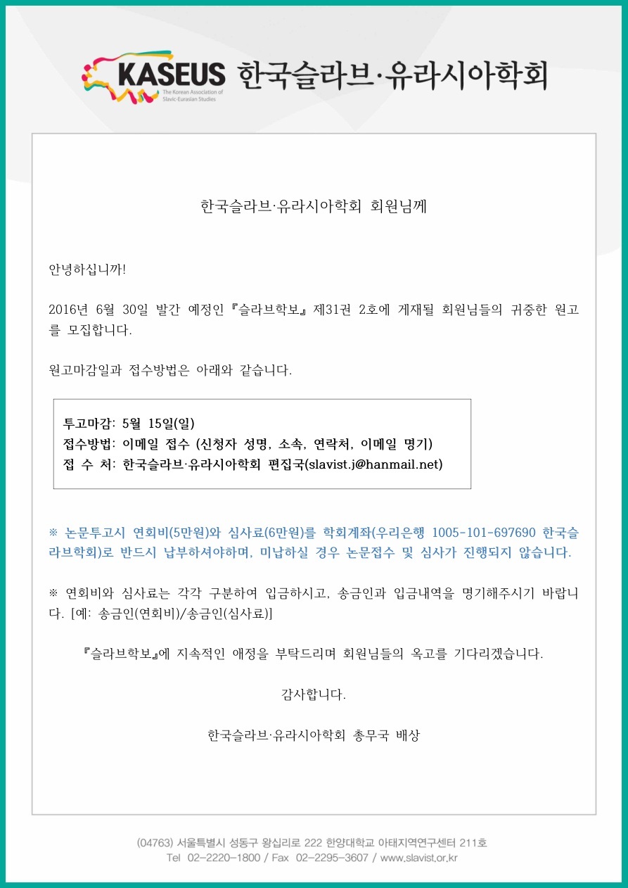 슬라브학보 제 31권 2호 논문투고 안내입니다.