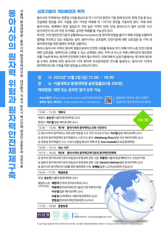 심포지움에서는 총 6개의 과제에 관해 다국적 전문가들이 동아시아 지역 원자력 안전문제관련 연구를 발표하고, 동아시아 지역의