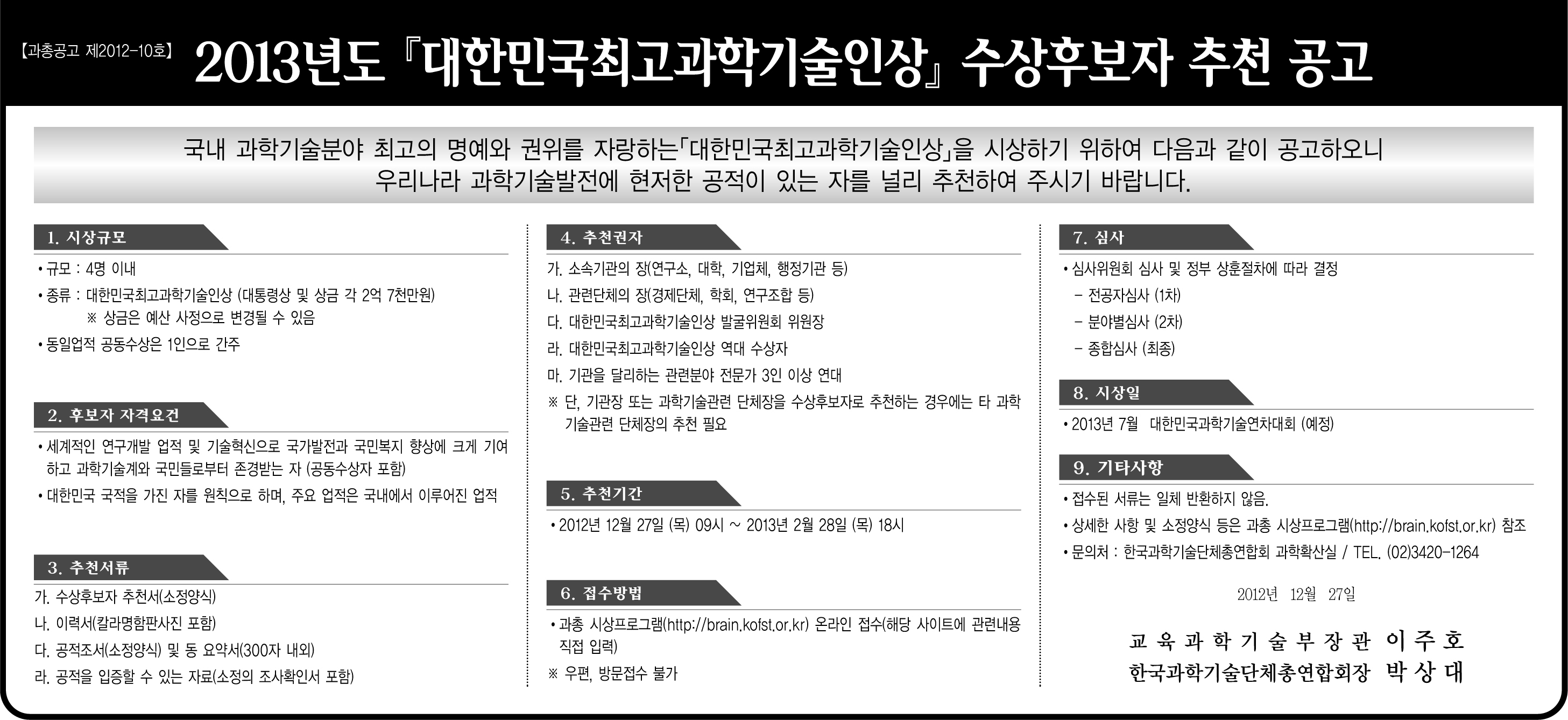 2013년도 대한민국최고과학기술인상 수상후보자 추천 의뢰