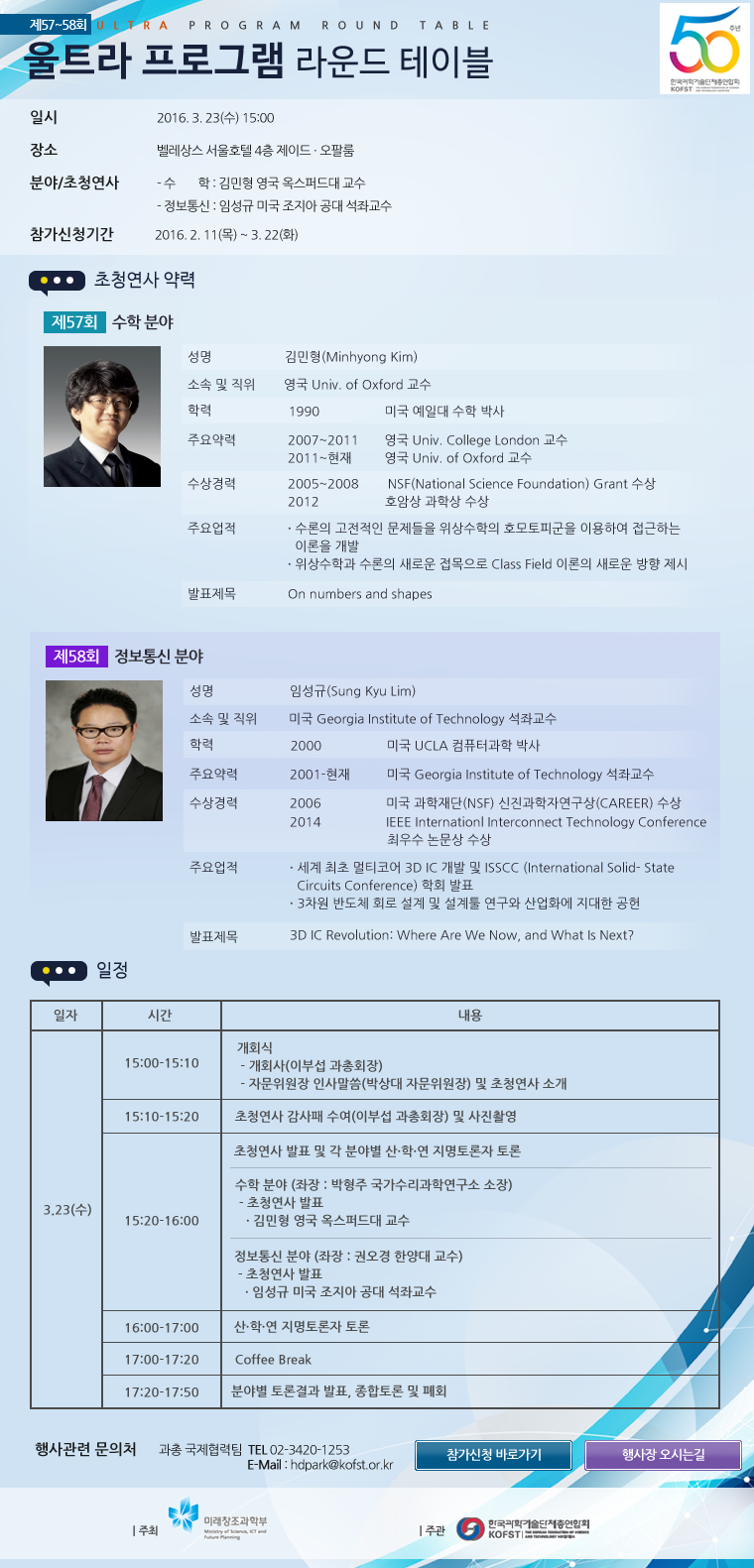 이번 울트라 프로그램은 서울 벨레상스 서울호텔에서 수학 분야와 정보통신 분야 개최할 예정이며, 참석을 희망하시는 분은 과총 국제협력 통합 홈페이지(www.ultari.org) 접속하셔서 온라인 신청을 해주시면 되겠습니다.
