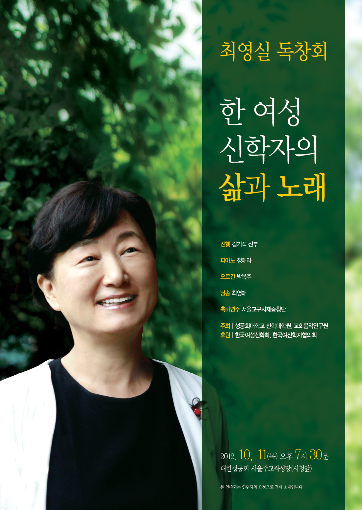 1. 이번에 개최되는 최영실교수 독창회는 성공회대학교 신학전문대학원과 교회음악연구원이 공동으로 주관하고, 한국여신학자협의회와 한국여성신학회의 후원으로 열립니다. 이 독창회는 기존의 독창회와는 조금 차별화되는 독창회라고 할 수 있습니다.