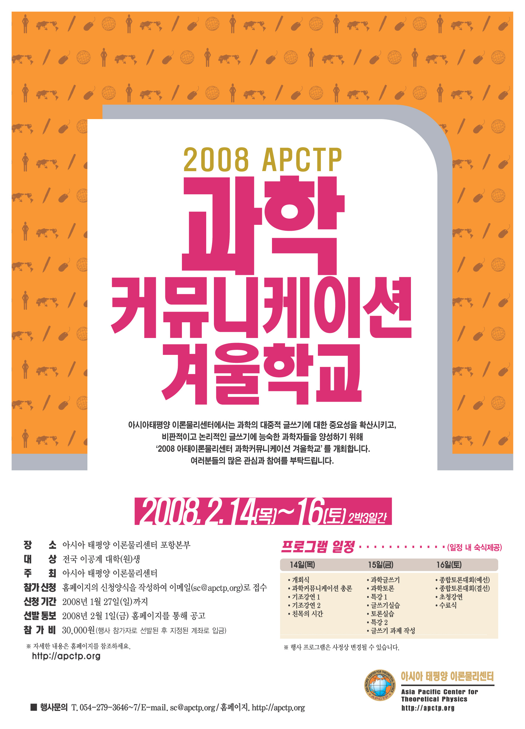 아시아 태평양 이론물리센터(APCTP)에서는 과학의 대중적 글쓰기에 대한 중요성을 확산시키고, 비판적이고 논리적인 글쓰기에 능숙한 과학자들을 양성하기 위해 ‘2008 아·태이론물리센터(APCTP) 과학커뮤니케이션 겨울학교’를 개최하고자 합니다. 여러분들의 많은 관심과 참여를 부탁드립니다.