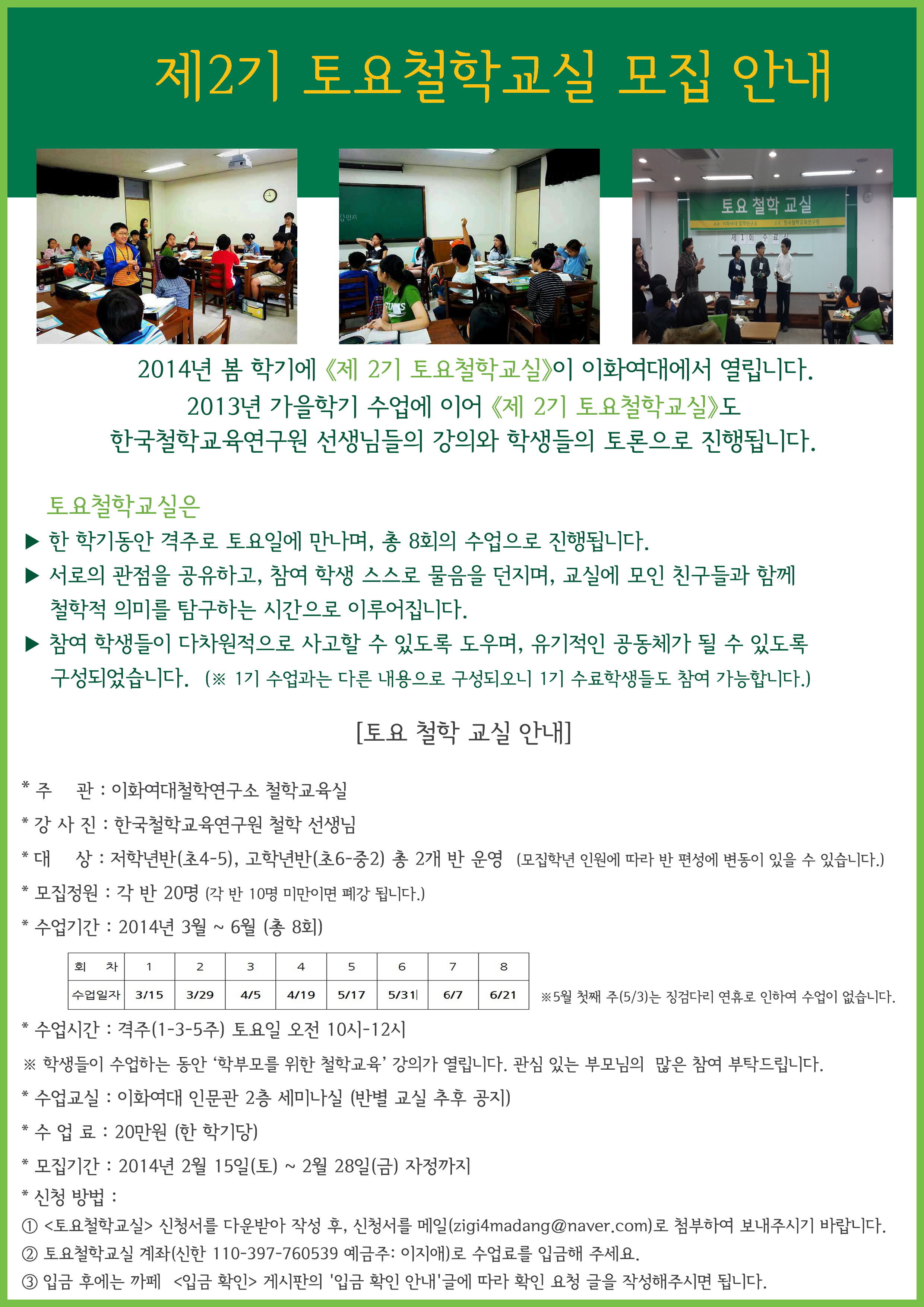 이화여대철학연구소 철학교육실에서 주관하는 《토요철학교실》제2기가 이번 봄학기에 시작됩니다.