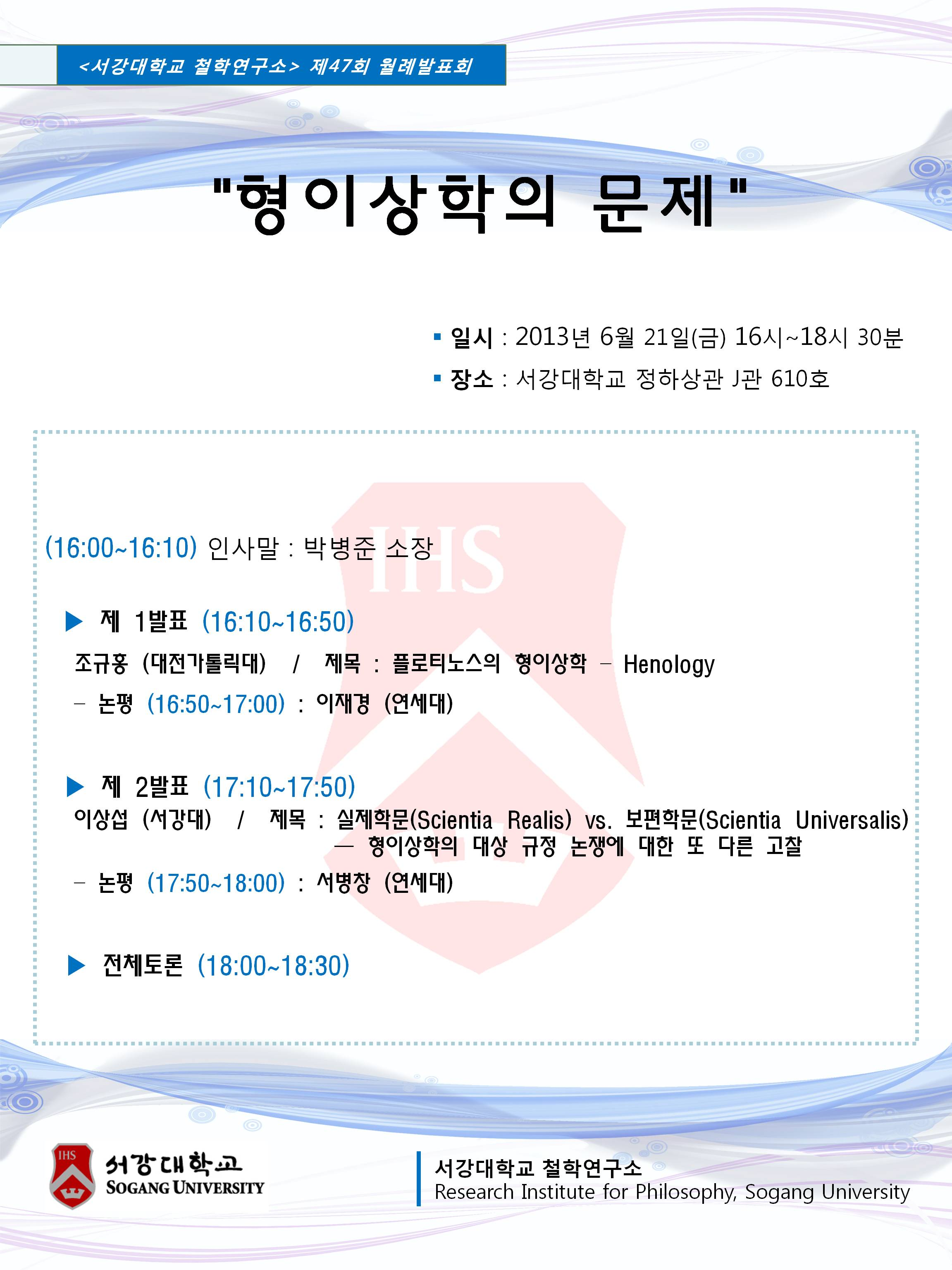 주제 : 형이상학의 문제 일시 : 2013년 6월 21일(금) 16시~18시 30분 장소 : 서강대학교 정하상관 J관 610호 ------------------------------------------------------------------------------------- 순서 (16:00~16:10) 인사말 : 박병준 소장 제 1발표 (16:10~16:50) 조규홍 (대전가톨릭대) / 제목 : 플로티노스의 형이상학 – Henology – 논평 (16:50~17:00) : 이재경 (연세대) 제 2발표 (17:10~17:50) 이상섭 (서강대) / 제목 : 실제학문(Scientia Realis) vs. 보편학문(Scientia Universalis) ㅡ 형이상학의 대상 규정 논쟁에 대한 또 다른 고찰 – 논평 (17:50~18:00) : 서병창 (연세대) 전체토론 (18:00~18:30) |