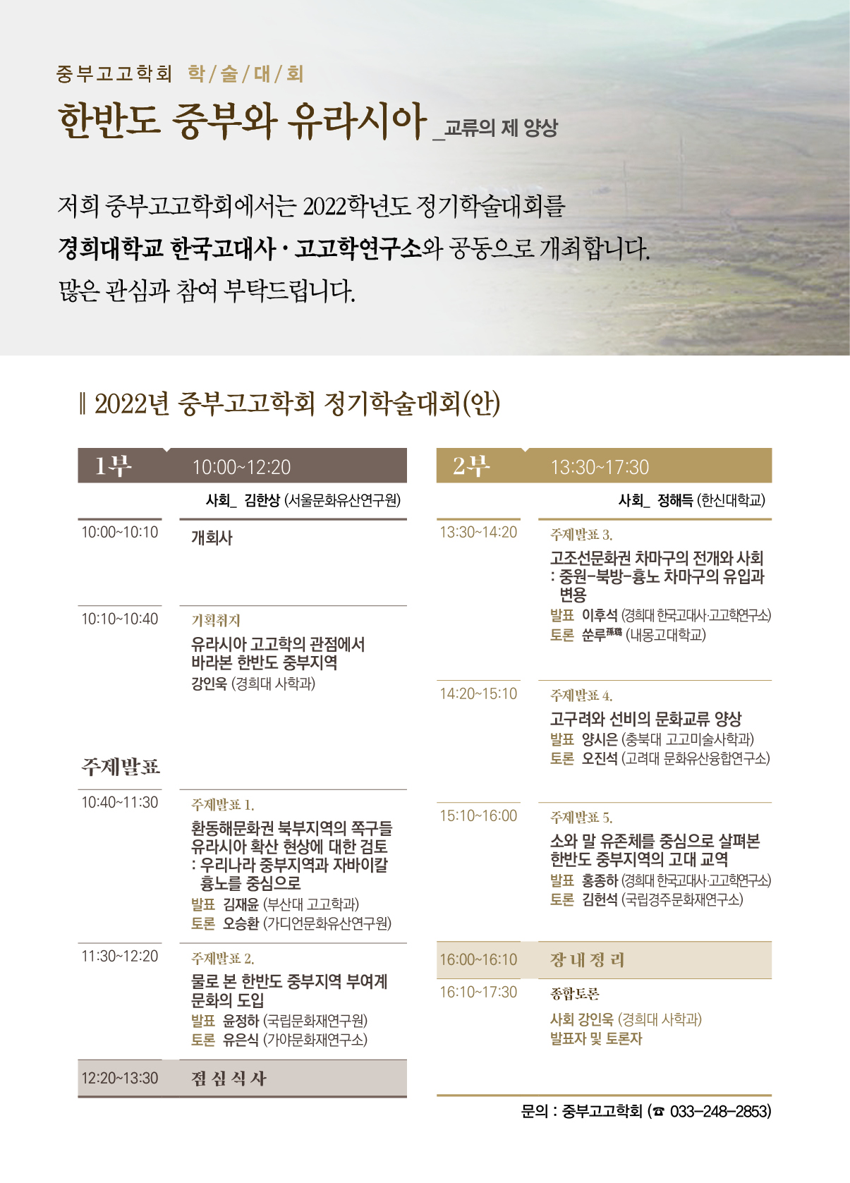 중부고고학회에서 [한반도 중부와 유라시아-교류의 제 양상]을 주제로 2022년 정기학술대회를 개최합니다.