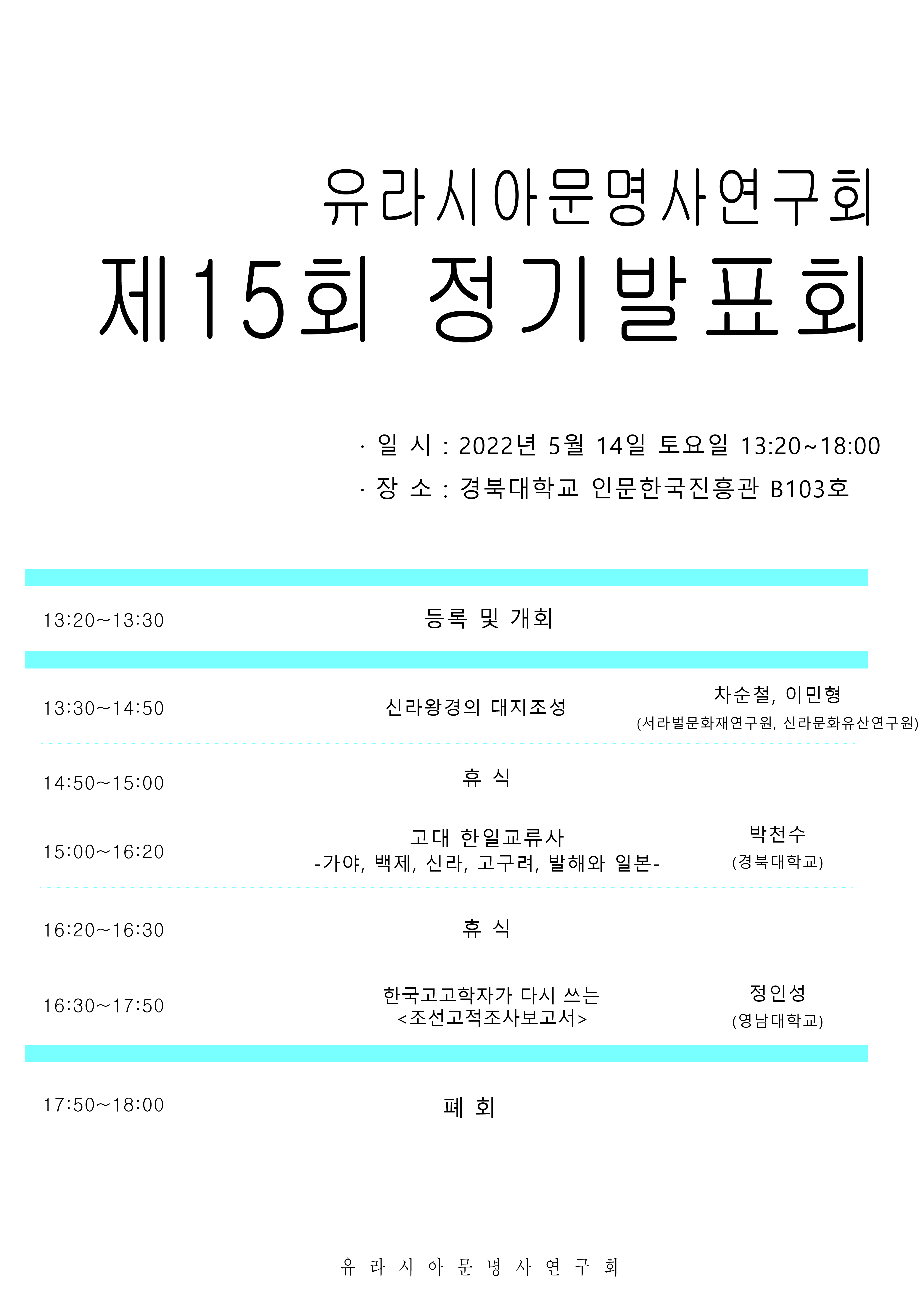2022년 5월 14일 토요일, 〈유라시아문명사연구회 제15회 정기발표회〉를 개최하고자 합니다.