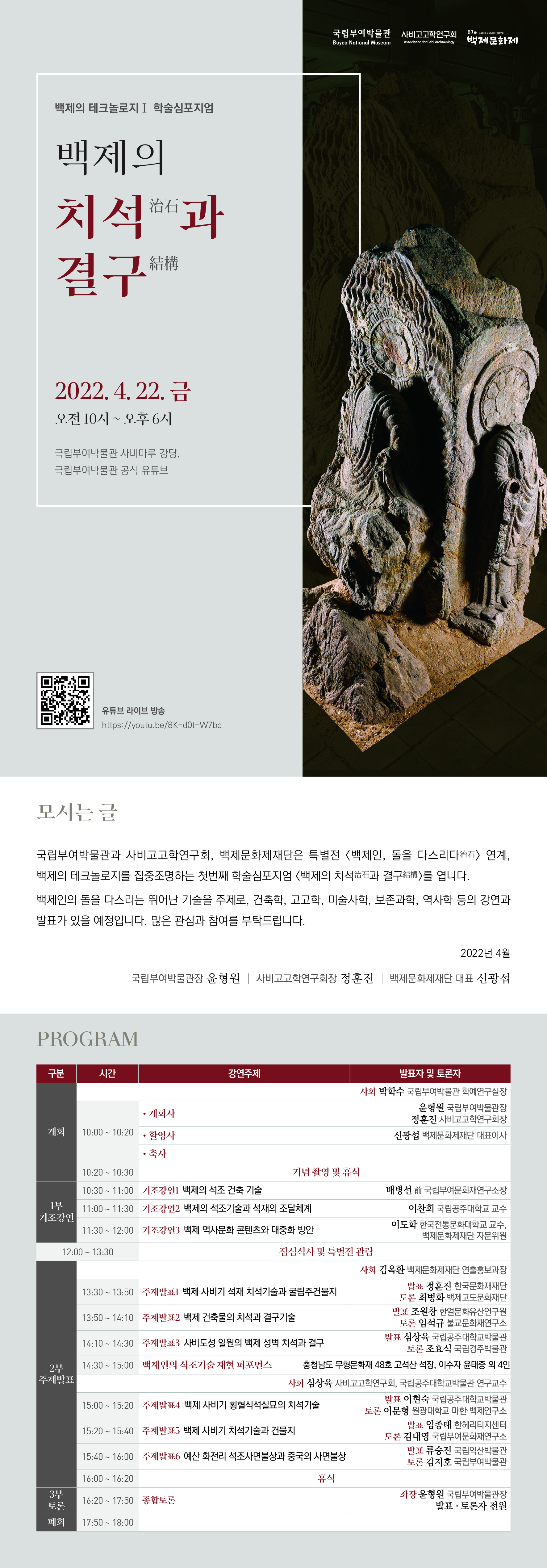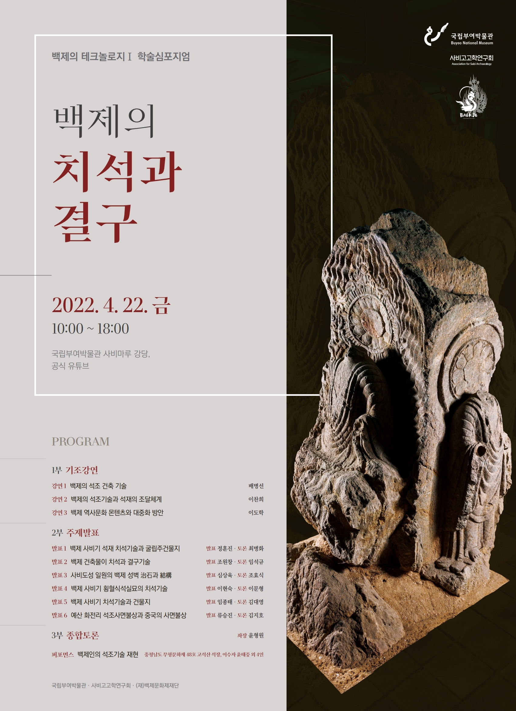 백제인의 돌을 다스리는 뛰어난 기술을 주제로, 건축학, 고고학, 미술사학, 보존과학, 역사학 등의 강연과 발표가 있을 예정입니다. 많은 관심과 참여를 부탁드립니다.